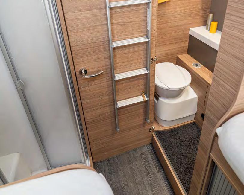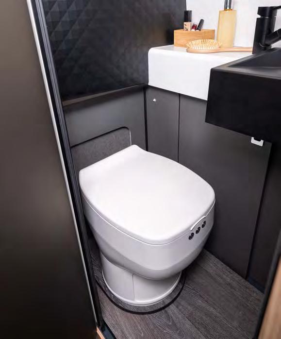 Den absoluta höjdpunkten i badrummet är det moderna, utdragbara handfatet och den hållbara CLEANFLEX-toaletten. Den är enkel att flytta och ger mycket plats åt att duscha.