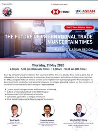 The Chamber also invited the British High Commissioner to Malaysia, His Excellency Charles Hay MVO to a breakfast talk on the EU exit in February, and to a virtual roundtable in April where he dialogued with several UK member companies and shared the High Commission’s COVID-19 efforts as well as the Department for International Trade’s role in supporting UK businesses in Malaysia. In addition, we hosted Natalie Black CBE, Her Majesty’s Trade Commissioner for Asia Pacifc in a special webinar about trade and investment opportunities in Malaysia and the Asia Pacifc.