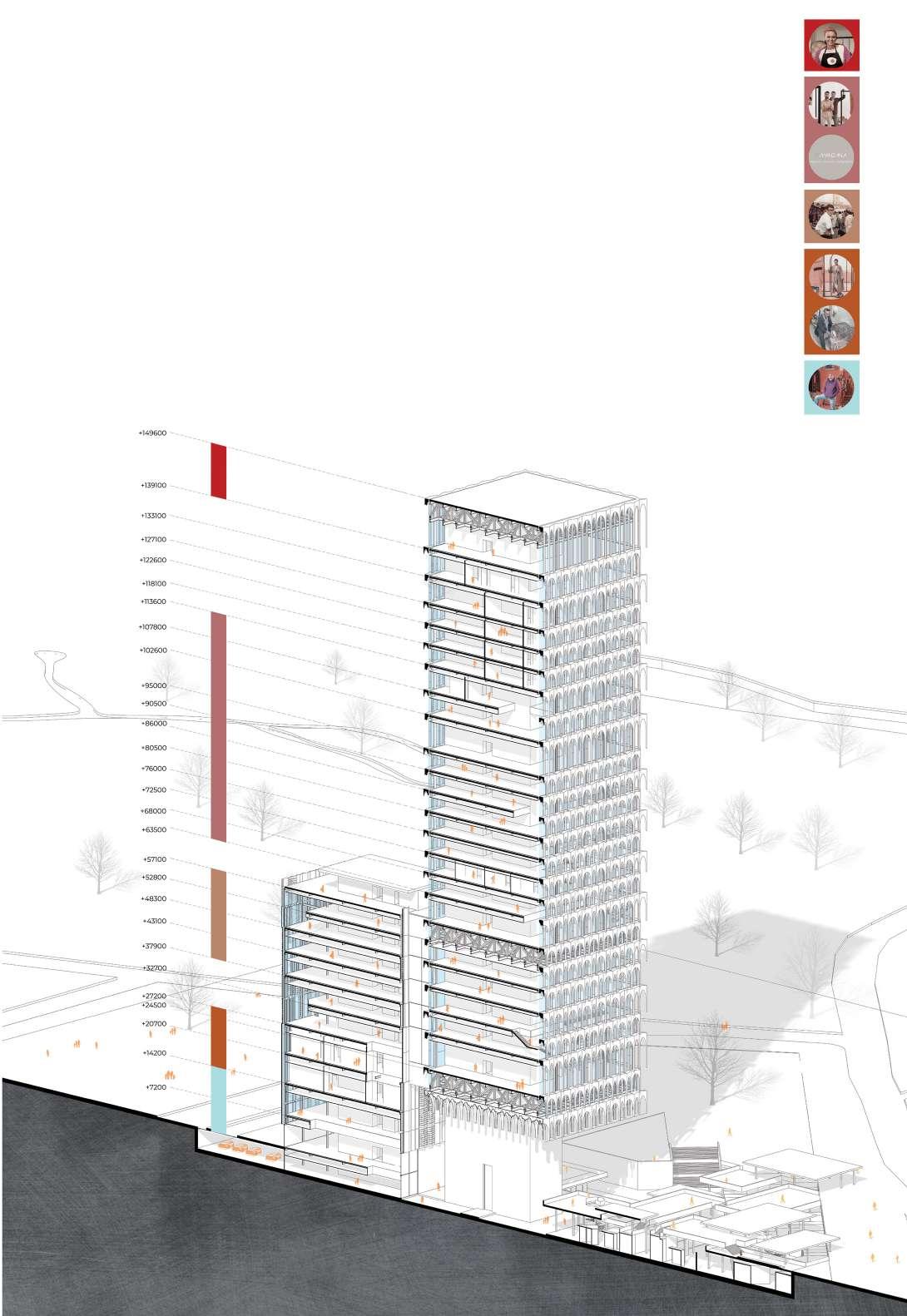 Two building masses- division based on the functions, the short one acting as a strong base, uplifting and balancing the Tall mass “minaret”. Beneath that we propose a souk- rendering the idea of an abstract version of our interpretation of moroccon heritage into the project.