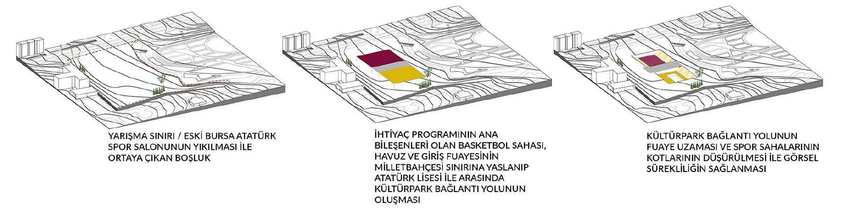 The main idea of our project is to try to reconstruct the holistic green texture of the Beylikbahçe berry or Vakıf Bahçe region before the destroyed Bursa Atatürk Stadium. The proposal was handled with a setup that fits in its location, creates space for all possible pedestrian movements and flow, establishes relationships between different urban modes, and offers functionally refined and clear solutions.
