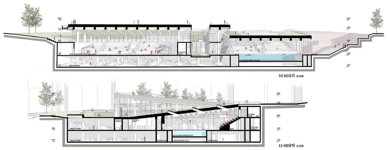 The program components, which were covered with a simple plaque, were gathered in two main parts. For the Basketball Hall, which opens its face to the city, and the Pool, which moves away from Stadium Street and approaches Kültürpark and tries to remain a little more secret, the top cover is articulated to provide the existing denim relations. In this way, sloping surfaces both opening to the National Garden and overlooking the Atatürk High School garden emerge. The volumes defined by these covering surfaces, which are the continuation of the garden floor, also observe the volumetric qualities and standards required by the program.