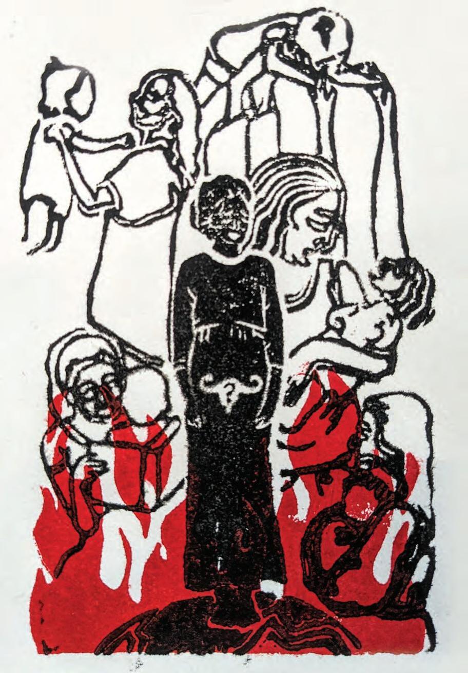 I examine our reflections in the greasy, fingerprintsmeared mirrors that line the second floor hallway. My grandmother sits, caving into a multitude of buttoned up sweaters, scarfs and hats. Her face rests somewhere underneath layers of cotton and wool. My mother feels a compulsive need to protect her from the excruciating cold of sixty-degree weather. My legs cast hollow shadows on red tiles, and for a moment, I feel foggy eyes examining me from the wheelchair. I wasn’t aware she could see me without emerging from her nest.
