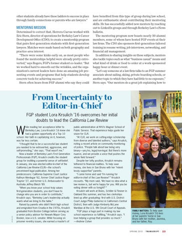 public administration at NYU’s Wagner School of Public Service. That experience helps guide her vision for CLR. “At CLR, we work on cutting-edge scholarship from diverse and talented authors,” says Krsulich, noting a recent article on community monitoring of police. “People talk about law being very binary—yes/no, legal/non-legal. But there’s more nuance, and we provide a voice that pushes the whole field forward.” Despite her lofty position, Krsulich remains tethered to financial realities. To help save money, she lives in San Bruno with her “relentlessly supportive” parents. “I came home and said ‘I’m running for editor-in-chief of the Law Review !’ ” Krsulich recounts. “My mom said, ‘We have no idea what a law review is, but we’re happy for you. Will you be eating dinner with us tonight?’ ” Krsulich will work at Boies, Schiller & Flexner in Oakland this summer, and has two clerkships lined up after graduating: first with U.S. District Court Judge Philip Gutierrez in California’s Central District, then with Judge Kimberly McLane Wardlaw at the U.S. 9th Circuit Court of Appeals. “FGP plays a huge part in making my law school experience so fulfilling,” Krsulich says. “I love helping a group that provides so much.” —Andrew Cohen