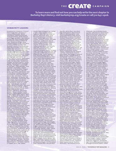 COM MU N IT Y LE AD E R S Anonymous (101) · Anonymous, in honor of Ruth & George Staten · Anonymous, in memory of Kathy Scudder · Tarliena Aamir-Balinton · Barbara & Richard Abel · Fred & Joanne Abrams · Jennifer Adcock & John D. Boggs · Joy Addison · Mark Addleman & Andrea Clark · Miriam & Matthew Agrell · Alexis Akervik, in memory of William Ian Fraser · Shirley & Lew Albright · Mussa Al-Bulushi & Kathryn Horsley · Kevin Alecca, in memory of William Ian Fraser · Ruth Alexander, in memory of Dorothy Jansizian · Abbey Alkon & Jonathan Leonard · Fred & Kathleen Allen · Gertrude E. Allen, in memory of Robert Allen · Roy & Judith Alper · Sara Alspaugh · Peggy & Don Alter · Mark Amaro · Susan E. Amrose · Ethan Andelman & Laura Mytels · Charles & Joyce Anderson · Elisabeth Andreason and Melissa Allen · Jeff Angell & Joan King-Angell · Joan Armenia · Ann Armour · Sharon A. Ascencio · James Ashburn III · Jane Ashland · Naomi Auerbach & Ted Landau · Ms. Nancy Auker · David & Vivian Auslander · The Austin Group LLC · Carmen Aydelott · Patricia Bacchetti · Anna Badger · Philip Baer · Patt Bagdon · J. Karren Baker · Ms. Janet Baker · Linda & Mike Baker · Lisa & David Baker · Rachel Bakker · Elizabeth Balderston · Dr. Beverly Ballard · Margaret Ballou · Michelle L. Barbour · Mary Jane Barclay · Laurie Barkin · Judith Barmack · Kent & Carolyn Barnes · Michael & Della Barnett · Azucena Barocio · Susan & Barry Baskin · Sherry D. Bass · Eileen Battat · Frank & Lee Battat · Barbara Baum · Ann Bauman · Joan Baylie & James Mullins · Francine Beall · Jim & Donna Beasley · Brian & Mary Bechtel · Steven Beckendorf & Cynthia Hill · Natasha Bell · Marie Bendy, in honor of C. Joseph Bendy · Charles Benedict · Alice Benet · Kathleen Bennett & Tom Malloy · Mary Ann & Len Benson · Audrey M. Berger · Jonathan Berk & Rebecca Schwartz · Brenda L. Berlin · Richard & Kathy Berman · Kevin G. Bermudez · Judith Berne · Jeffry & Diane Bernstein · Thomas G. Bertken · Caroline Beverstock · Barbara Bigelow, in memory of Dr. Welby Bigelow · Becky J. Bigelow · Elaine Binger · Steve Bischoff · Catherine M. Bishop & Ken Donnelly · Mina & Monty Bissell · Odette Blachman · Naomi Black · Diana BlackKennedy · The Blackman Family · Lucia Blakeslee · Susan Blank · Helmut Blaschczyk · Beverly Blatt & David Filipek · Irwin & Rita Blitt · Robin & Edward Blum · Nona Bock · Christopher Bogart · Bonnie Bogue · Beverley Bolt · Juliet Bonczkowski & Family · Randy Borden · Susan & Rick Boreliz, in honor of Rio Falik-Segre · Karen Bowen & Beth Gerstein · Joanne Bowsman · Barbara Boyington · David & Eva Bradford · Dr. Joan Bradus & Mr. Dale Friedman · Erin Branagan & Sergio Kakehashi · Esta Brand · Robert & Barbara Brandriff · Sheila Braufman · Steve Braunstein, in memory of William Ian Fraser · Alice Breakstone & Debbie Goldberg · Aida Brenneis · Barbara & Ray Breslau · Sandra Briggs · Eugenia Brin · Eric Brink & Gayle Vassar · Cathy Bristow · Nancy Broderick · Broitman-Basri Family · Craig Broscow · Carol L. Brosgart, M.D. & Joseph Gross · Donna B. Brott · Barbara J. Brown · Byron Brown · Don & Carol Anne Brown · Donald Brown · Marc & Ellen Brown · Myrna Brown · Kay Browne · Jill Bryans · Wendy Buchen · Richard Bugg · Dr. Alan Burckin & Carol Olmert · Jennifer Burden · Julie & Stan Burford · Gretchen Burgess, in memory of William Ian Fraser · Jean Burke · Carrie & Jim Burroughs, in honor of Kerry Francis · Ann Butcher · Alice Butler · Dave & Diana Butler · Jim Butler · Pam & Jeff Byers · Linda Cain · Edward & Joan Callaway · Robert P. Camm & Susan Pearson · Katherine R. Campbell · John E. Caner · Barbara