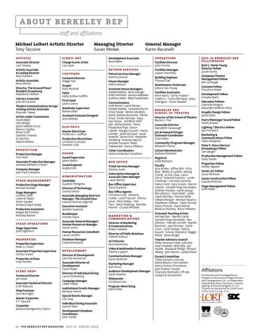 OP E R AT ION S Facilities Director John Horton Facilities Manager Lauren Shorofsky Building Engineer Thomas Tran Maintenance Technician Johnny Van Chang Facilities Assistants Kevin Barry · Sonny Hudson · Sophie Li · Carlos Mendoza · Jesus Rodriguez · Oliver Sweibel BERKELEY REP S C HO OL OF T H E AT R E Director of the School of Theatre Rachel L. Fink Associate Director MaryBeth Cavanaugh Jan & Howard Oringer Outreach Coordinator Dave Maier Community Programs Manager Benjamin Hanna School Administrator Kashara Robinson Registrar Katie Riemann Faculty Alva Ackley · Jeffrey Bihr · Erica Blue · Rebecca Castelli · Jiwong Chong · Iu-Hui Chua · Laura Derry · Deborah Eubanks · Lucille Freedman · Christine Germain · Nancy Gold · Gary Graves · Marvin Greene · Gendell Hing-Hernández· Andrew Hurteau · Aaron Jessup · Ben Johnson · Dave Maier · Julian López-Morillas · Patricia Miller · Edward Morgan · Michael Navarra · Madeleine Oldham · Slater Penney Marty Pistone · Diane Rachel · Rebecca Stockley · Bruce Williams Outreach Teaching Artists Michael Barr · Mariah Castle · Gendell Hing-Hernández · Ben Johnson · Hannah Lennett · Marilet Martinez · Jack Nicolaus · Sarita Ocón · Carla Pantoja · Patrick Russell · Tommy Shepherd · Reggie White · Elena Wright Teacher Advisory Council Molly Aaronson-Gelb · Julie Boe · Amy Crawford · Beth Daly · Jan Hunter · Marianne Philipp · Richard Silberg · John Warren · Jordan Winer Docent Committee Thalia Dorwick, Director Matty Bloom, Core content Nancy Fenton, Procedures Jean Holmes, Visuals Charlotte Martinelli, Off-site contact & recruitment
