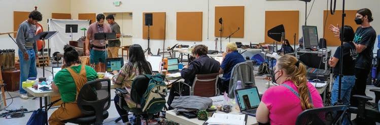 The actors have to hear each other as well as what they're playing and looping, so we have video monitors that show them where they are in the cycles, and in-ear audio monitors so they can hear what's happening all the time. Each actor wears two wireless lavalier microphones, a wireless handheld mic, and a wireless in-ear monitor, so we work closely with the costume department to coordinate where all that technology goes. Plus, we coordinate sound-making props with the props department — it's a real all-department collaboration. Our backstage audio engineer, Courtney Jean , manages all these wireless elements and makes sure all the instruments are tuned and in working order before and during the show.