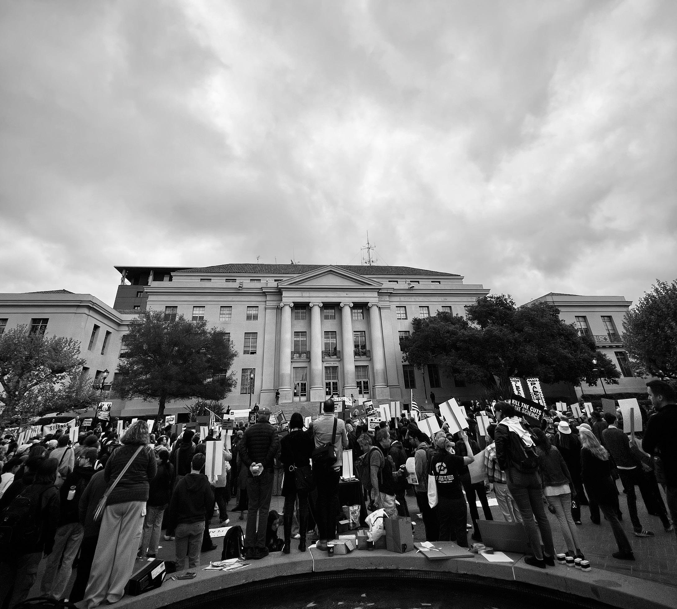 “Day of Action for Higher Education” assembly at Sproul Plaza in April 2025 to protest against policies affecting educational funding and academic freedom