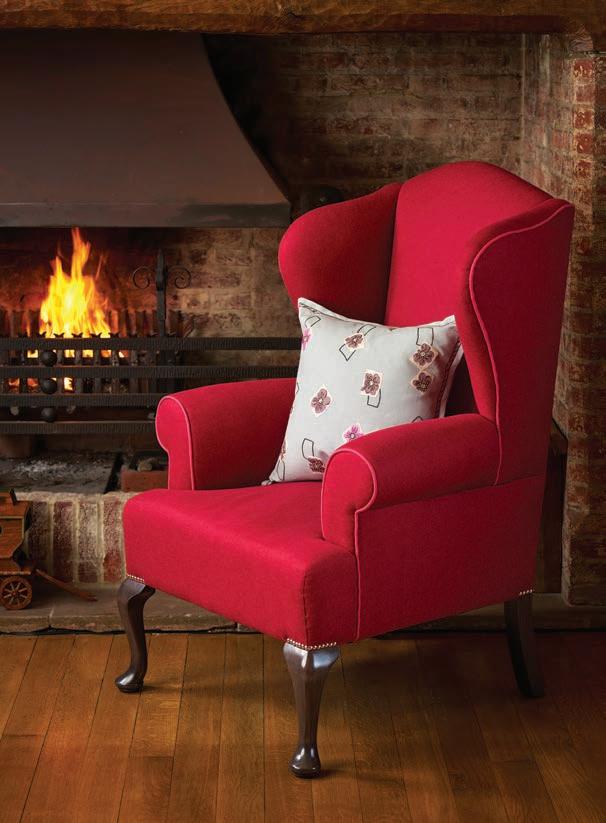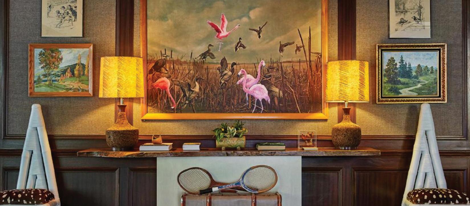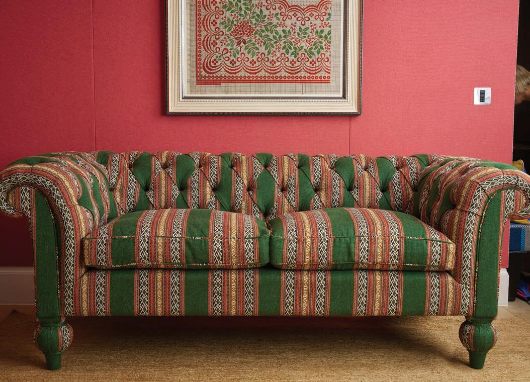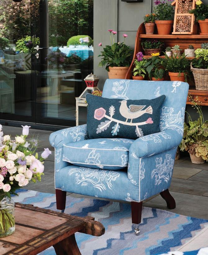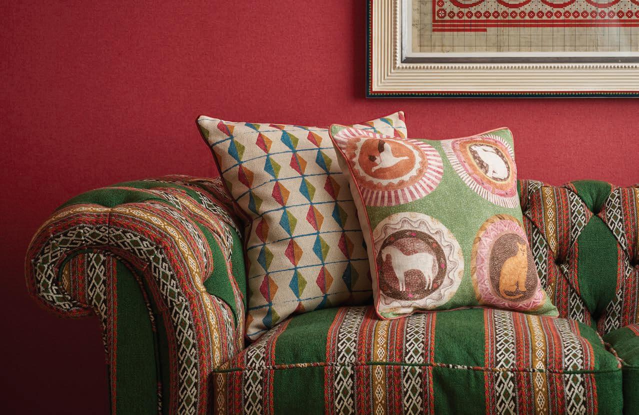 Now guests can bring that vibrance home in several ways, from framed artwork to custom furniture. Some favor the handcrafted 3 Plank Coffee Table or the Melissa Sofa, with its prominent rolled arms and deep button tufting, and others complement a living space with Kit’s iconic Wing Chair or the Leo Chair (the charming “Friendly Folk” pattern is inspired by rural English folklore).