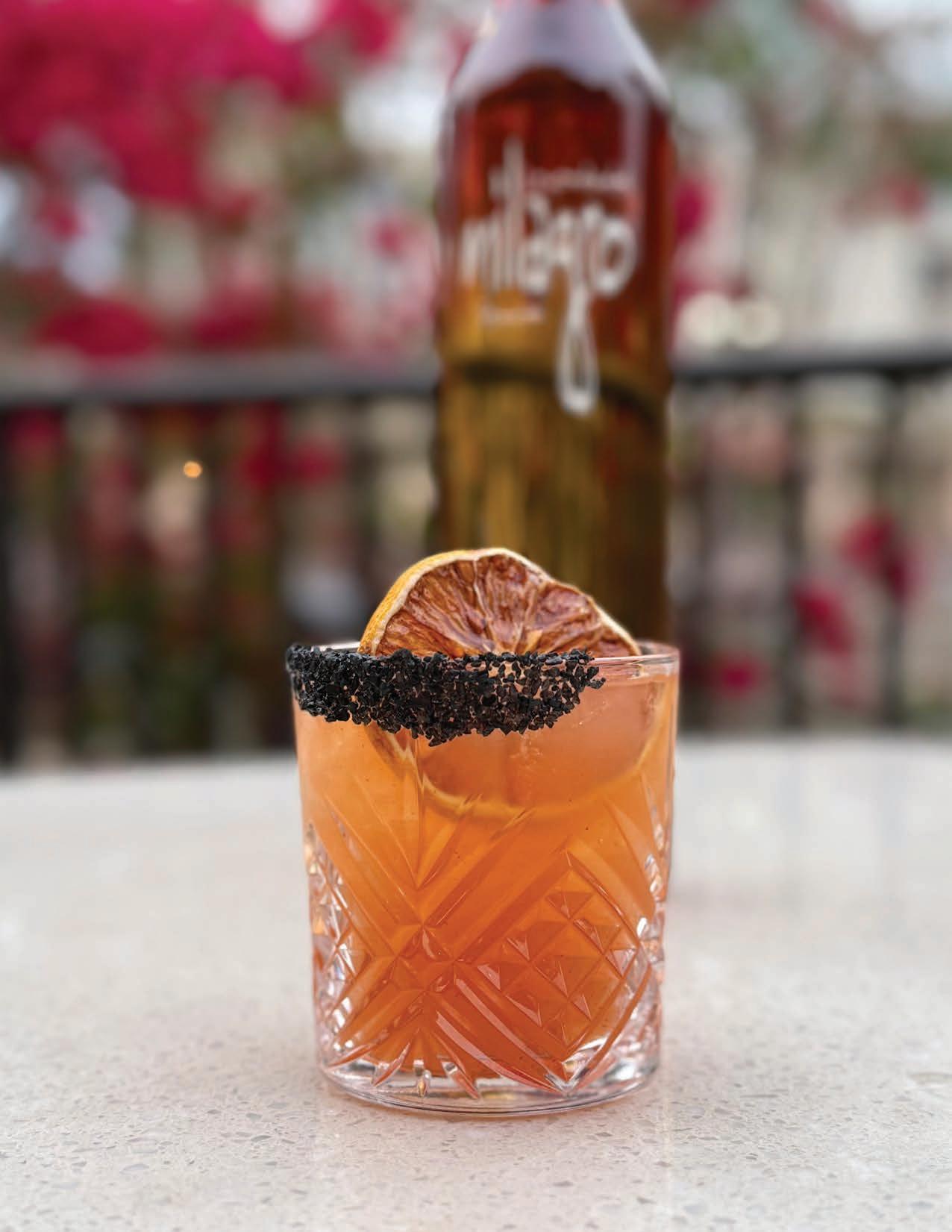 Shake in tin and strain into a rocks glass over a large ice cube. Garnish with dehydrated lemon and Chiltepin peppers.