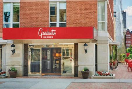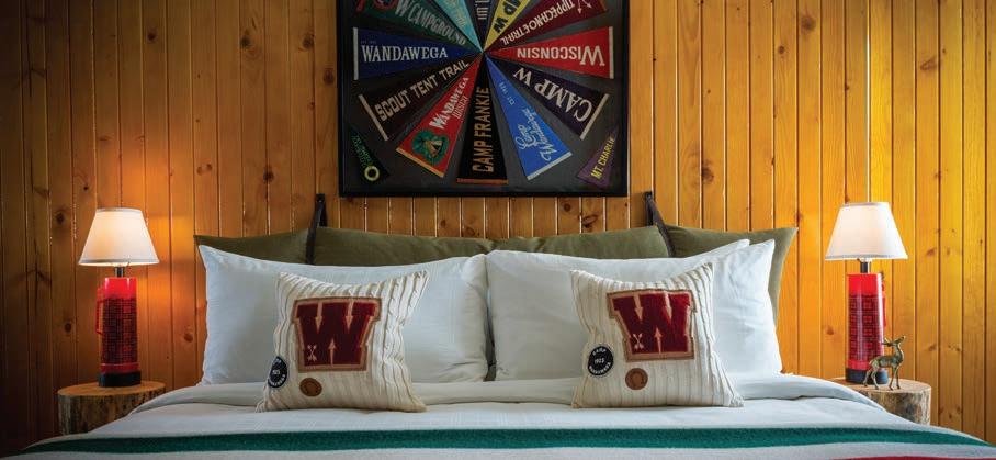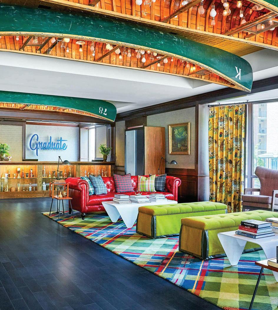 This downtown Madison hotel celebrates college town spirit, colorful Midwest history, and Wisconsin’s great outdoors. Discover locally sourced artifacts and details throughout—old high school yearbooks, woodpaneled walls evoking the state’s longstanding supper club culture, and the lobby’s vintage canoe “chandeliers,” a tribute to the region’s many lakes and accompanying activities. Rooftop restaurant Camp Trippalindee draws inspiration