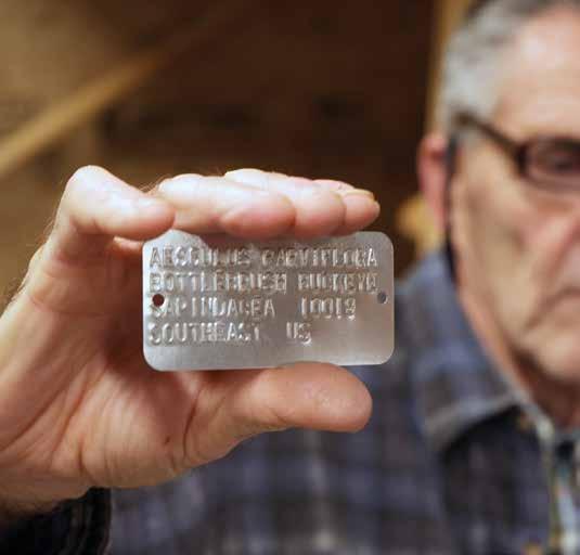Certainly, Joseph is the perfect volunteer for the job. He had a 38-year engineering career, first with General Electric and ending with his retirement 19 years ago from General Dynamics. He won’t be outsmarted by a pernickety Gravo-Graft, nor an Addressograph. He’s MacGyvered a standard stake to which he attaches those plastic labels. The stakes are made from metal strips originally intended to tie rafters together. With tin snips, he bevels the stake ends so they can easily be shoved into the soil.