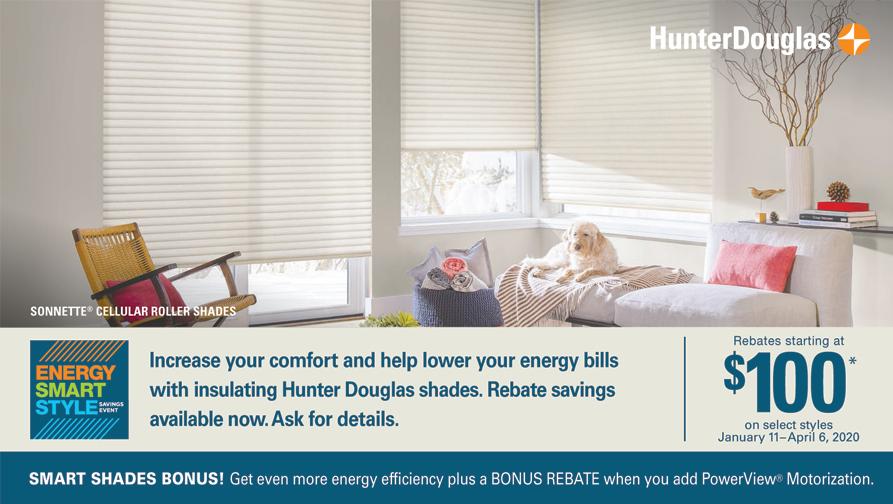 Mon.-Sat.7:30am-5:30pm sSun.9am-3pm *Manufacturer’smail-inrebateoffervalidforqualifyingpurchasesmade1/11/20–4/6/20fromparticipatingdealersintheU.S.only.BonusPowerView®rebateisonlyavailablewhenmakingaqualifyingpurchase. Rebatewillbeissuedintheformofaprepaidrewardcardandmailedwithin4weeksofrebateclaimapproval.Fundsdonotexpire.Subjecttoapplicablelaw,a$2.00monthlyfeewillbeassessedagainstcard balance6monthsaftercardissuanceandeachmonththereafter.Seecompletetermsdistributedwithrewardcard.Additionallimitationsmayapply.Askparticipatingdealerfordetailsandrebateform. ©2020HunterDouglas.Allrightsreserved.AlltrademarksusedhereinarethepropertyofHunterDouglasortheirrespectiveowners.20Q1NPSOC2