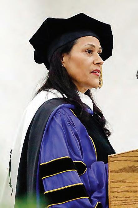After receiving an honorary degree from the college, Shannon Holsey, the president of the Stockbridge-Munsee Band of Mohican Indians, delivers the commencement address at the MCLA graduation ceremony in North Adams.