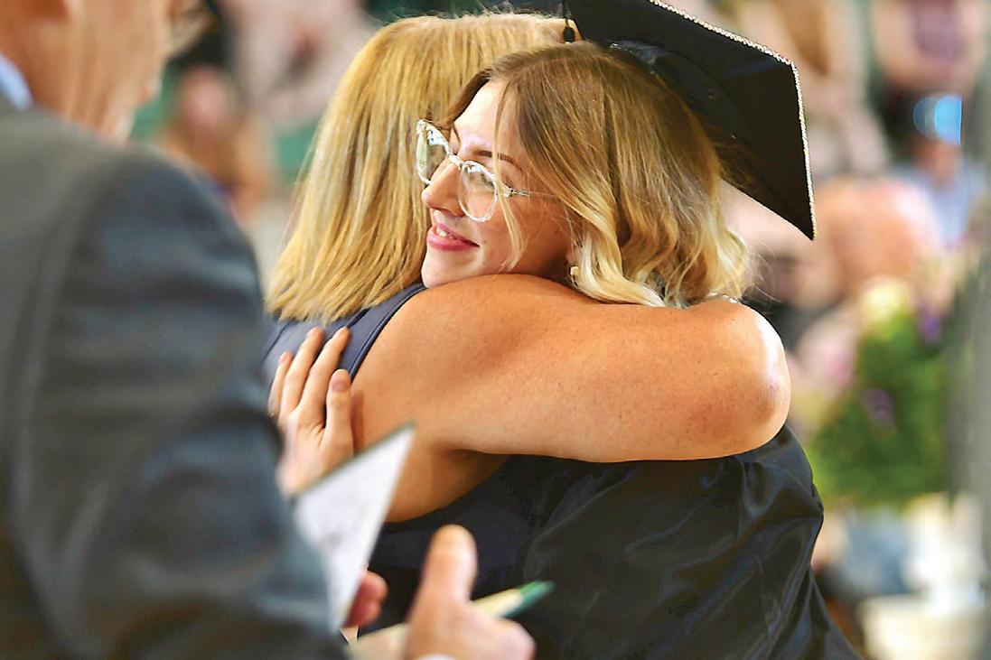 Friends embrace after commencement at Berkshire Community College at Tanglewood on May 31.