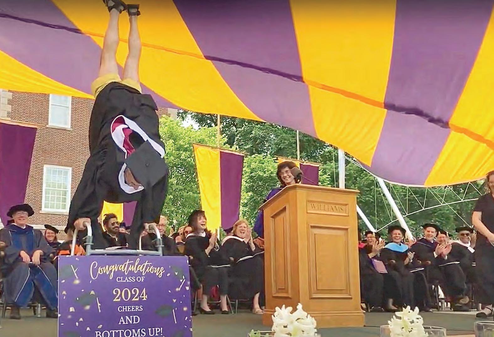 Memorable moment: Scott A. Lewis, who was retiring as assistant professor of physical education and associate director of the Williams Outing Club, brought a walker to the ceremony. In sandals and shorts, he performed a handstand as a parting gesture. The crowd roared with enthusiasm.