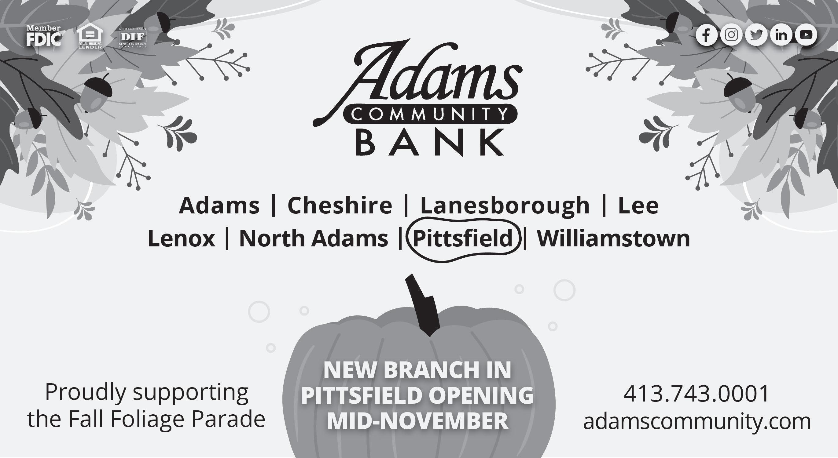 Parade begins at 1pm. The parade will commence at the lot by DiSanti Field, and conclude on Ashland Street after passing through downtown via Main Street. 1berkshire.com/calendar/fall-foliage-parade