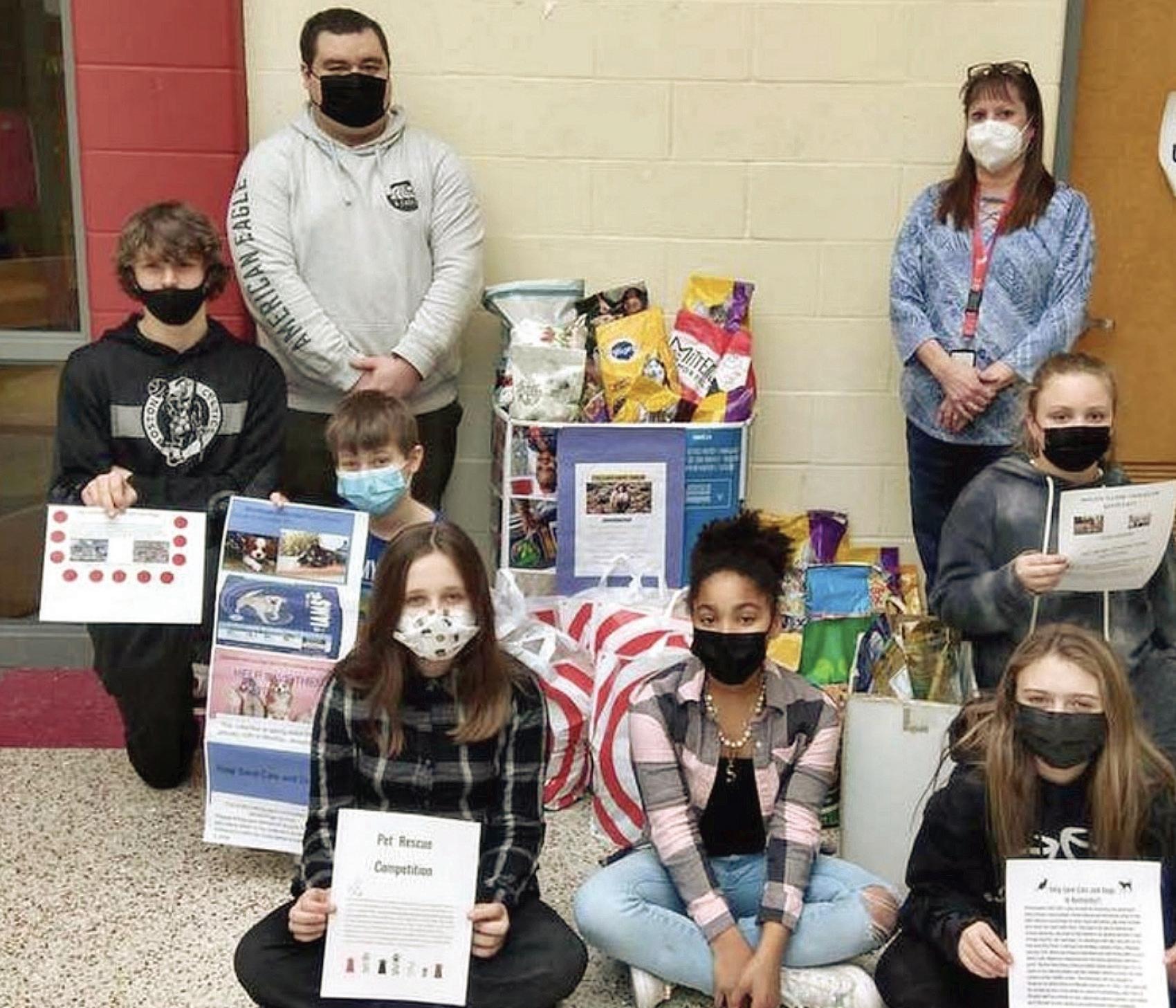 Hoosac Valley Middle School students show off posters they made for a donation drive that seeks to help animals displaced by tornadoes in Kentucky. Teachers Zach Houle and Jennifer Kline serve as co-advisers for the student council.