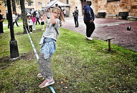 Linnéa 8 år, bar barnkorset i procession ut ur kyrkan och klarade sedan balanslinan galant under festen i kyrkoparken.