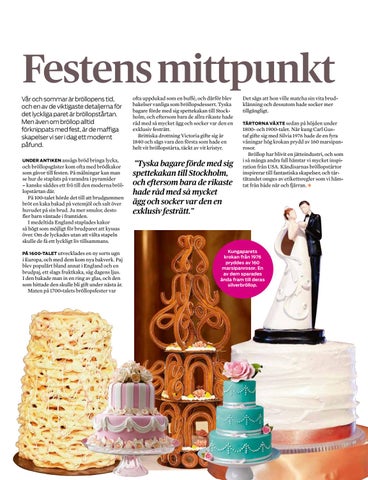 1800- och 1900-talet. När kung Carl Gustaf gifte sig med Silvia 1976 hade de en fyra våningar hög krokan prydd av 160 marsipanrosor. Bröllop har blivit en jätteindustri, och som i så många andra fall hämtar vi mycket inspiration från USA. Kändisarnas bröllopstårtor inspirerar till fantastiska skapelser, och tårtätandet omges av etikettsregler som vi hämtat från både när och fjärran.