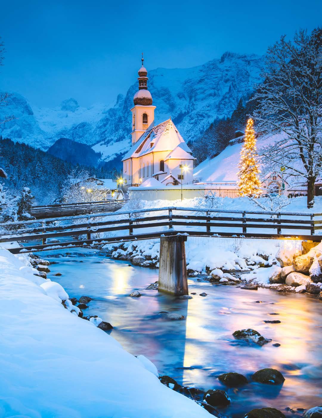 » Den där magiska tiden strax innan solen går ner helt och det blir mörkt, när himlen får ett blåaktigt skimmer. Det händer när solen är tillräckligt långt nedanför horison ten för att de blå våglängderna av ljuset dominerar, och vi ser faktiskt extra långt upp i himlen i det här ljuset, genom mesosfären och und re delen av termosfären. Ju längre bort från ekvatorn du är, desto läng re blir blå timmen. Inom konst och fotografering är det här mjuka ljuset mycket populärt. På bilden syns pil grimskyrkan Sankt Sebastian i byn Ramsau, i den tyska nationalparken Berchtesgaden.