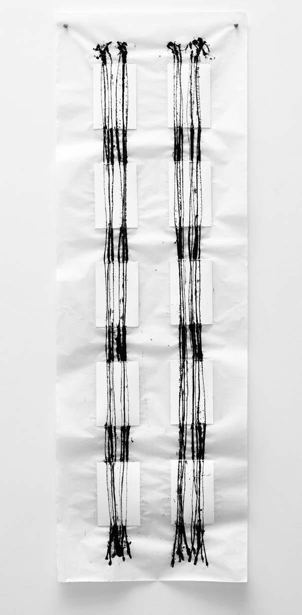 For the artist, the string and rope are sculptural graphic lines that alter perception of space. In some of the work the physical reality of the rope is left as a black imprint on the surface of the paper, in other work the string functions more as a brush that is making textured marks and lines on paper. The resulting marks capture not only a moment in time but also the phenomenological reality of the rope — its weight, tension, and interaction with the surface. The string and rope are caught in motion, suspended in a gesture that impacts the paper and leaves behind a trace of its presence. Each drawing becomes a quiet meditation on time, gravity, materiality, and perception — a record of what is seen, felt, and remembered.