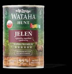 Wataha Hunt Junior 95% to pełnoporcjowa karma monoproteinowa, stworzona z myślą o szczeniętach. Wzbogacona chondroityną i glukozaminą, wspiera prawidłowy rozwój stawów i mięśni, zapewniając młodym psom energię oraz zdrowy start w dorosłość.