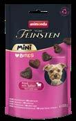 Nowość dla małych psów o dużych wymaganiach smakowych. Vom Feinsten Mini Bites to przekąski w kształcie serca, stworzone z 95% składników pochodzenia zwierzęcego, w tym 30% wołowiny, wzbogacone dodatkiem aromatycznej szałwii. Idealne jako nagroda, motywacja podczas treningu lub mały przysmak podawany na co dzień. Receptura bez zbóż, cukru, soi i wzmacniaczy smaku podkreśla wysoką jakość produktu i jego lekkostrawność. Mini Bites łączą wyjątkowy smak z troską o zdrowie i dobre samopoczucie dorosłych psów małych ras.