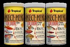 Wybarwiający pokarm dla wszystkożernych i mięsożernych ryb akwariowych na bazie trzech owadów: hermetii (15%), jedwabnika (15%) i mącznika młynarka (15%), z formułą Tropical’s Colour Booster. Pokarm dostępny jest w formie płatków oraz granulatu w rozmiarze S i XXS.