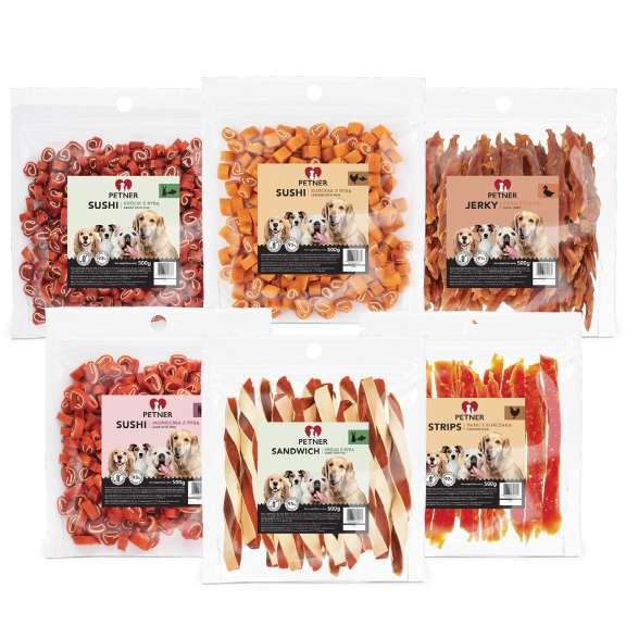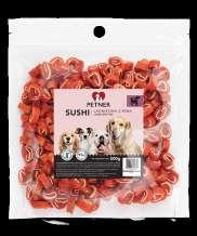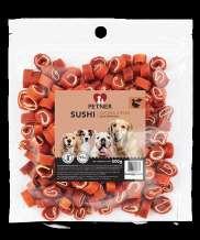 Przysmak, który sprawdzi się podczas spacerów lub jako zdrowa nagroda, to SUSHI . Podane w formie niewielkich, miękkich kąsków będą świetnym motywatorem do nauki nowych sztuczek. Sushi to również ulubiony przysmak psów małych ras oraz psów mających problemy z gryzieniem twardych gryzaków. Dostępne są cztery smaki.