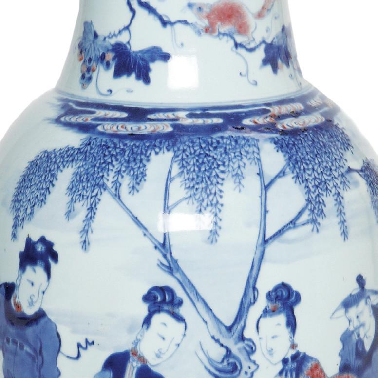 Kegelvormige vaas. Onderglazuurblauw decor met details in rood van een jonge vrouw in een duwstoel, omgeven doordienaar, dienaressen en ruiter, met rat op tak.