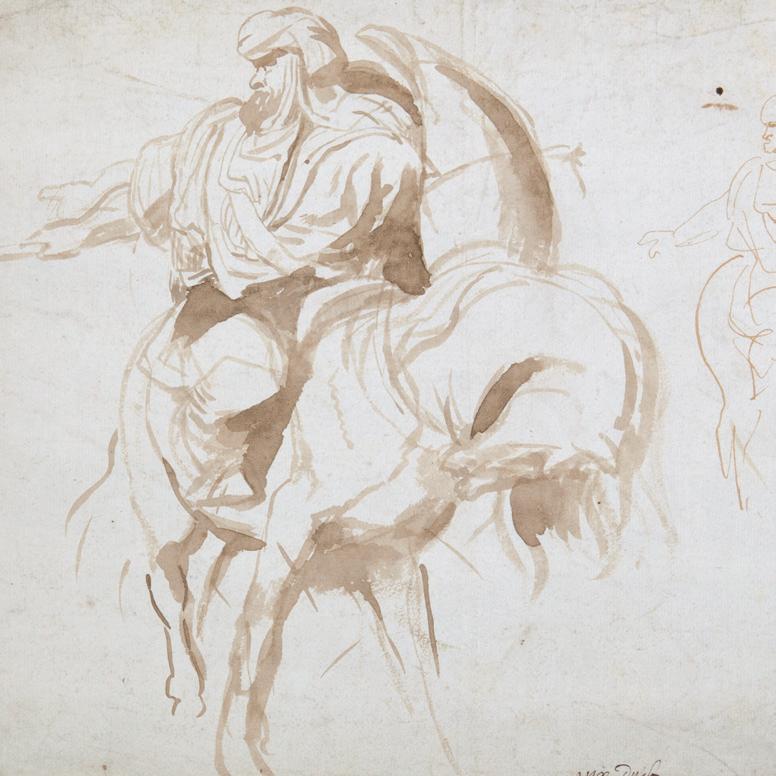 Studieblad met ruiters. Penseeltekening in bruine inkt op gefiligraneerd papier met watermerk.