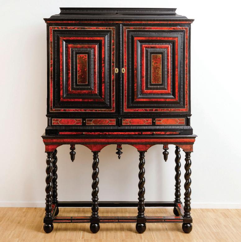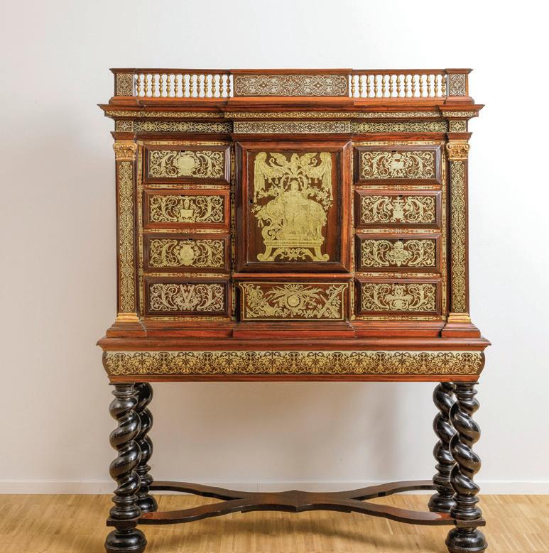 Kunstkabinet op voet met een allegorische voorstelling van de monarchie.