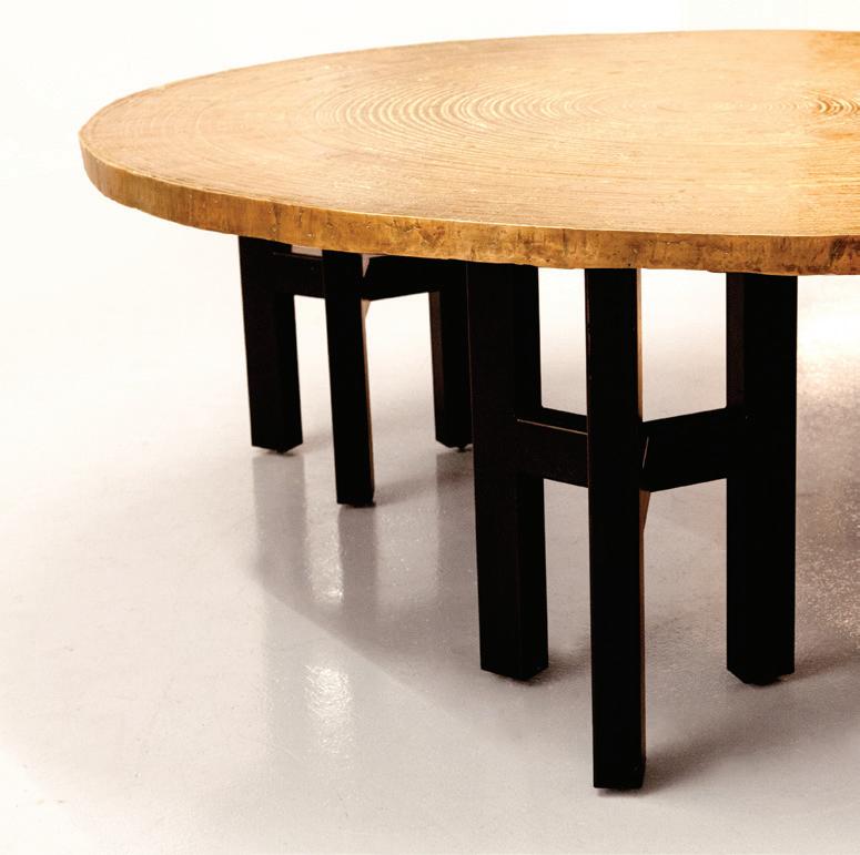 Eetkamertafel, model ‘Goutte d’eau’. Periode 1970. Bronzen blad met decor van concentrische cirkels.