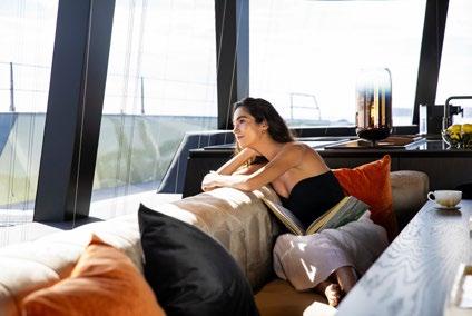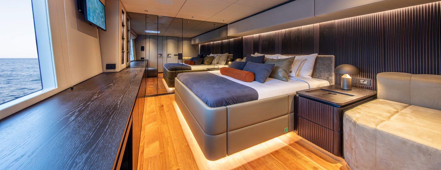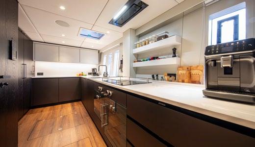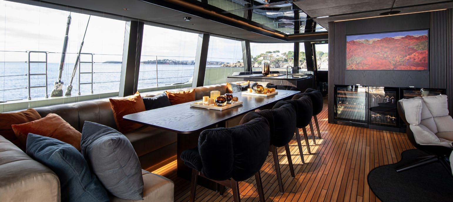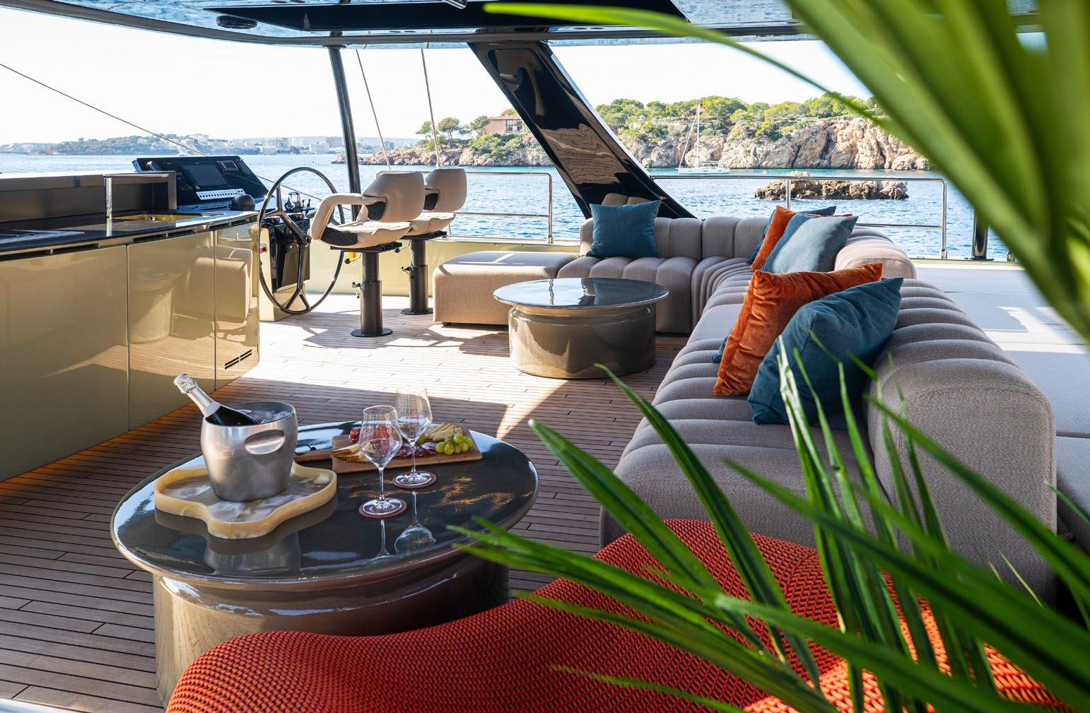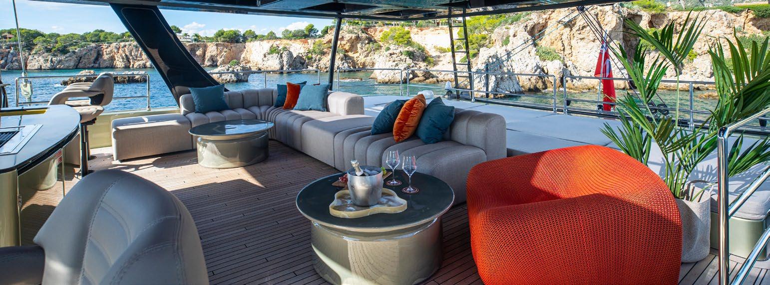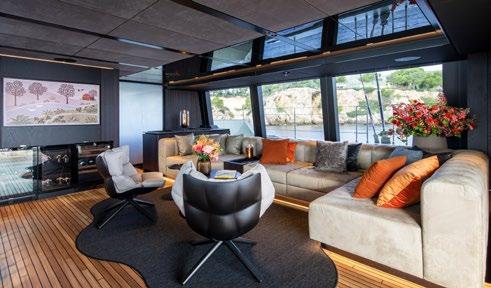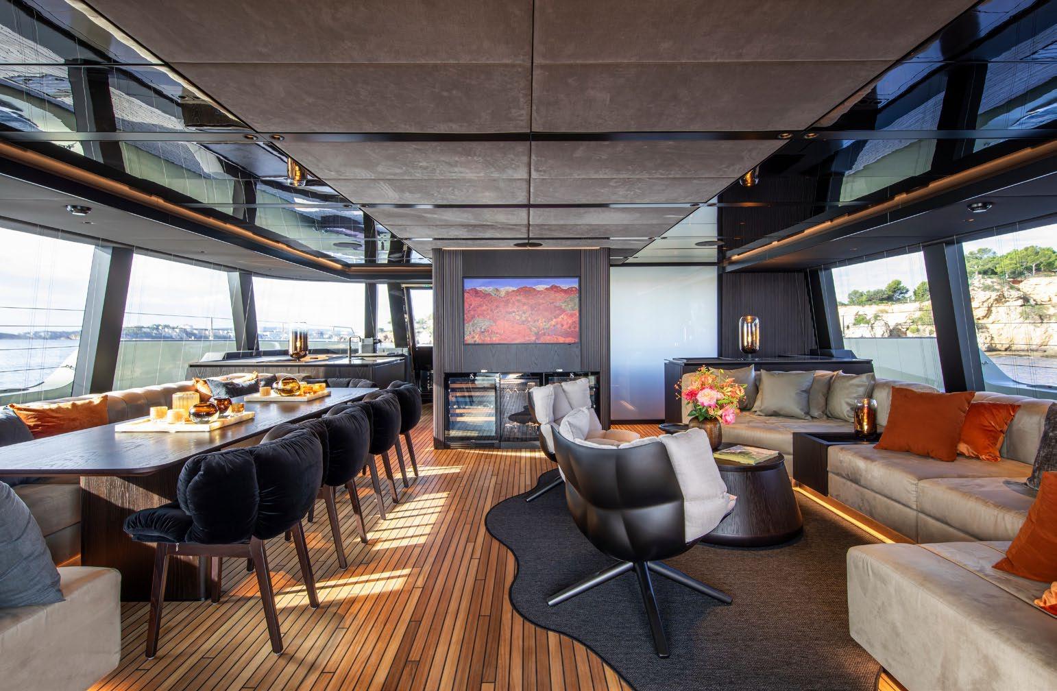 A large dining area and L-shaped sofa make for a very sociable space and red and orange finishes establish a warm and inviting atmosphere. The unique feature of separating the wheelhouse from the main saloon means guests can benefit from privacy and truly feel that the space is their own.