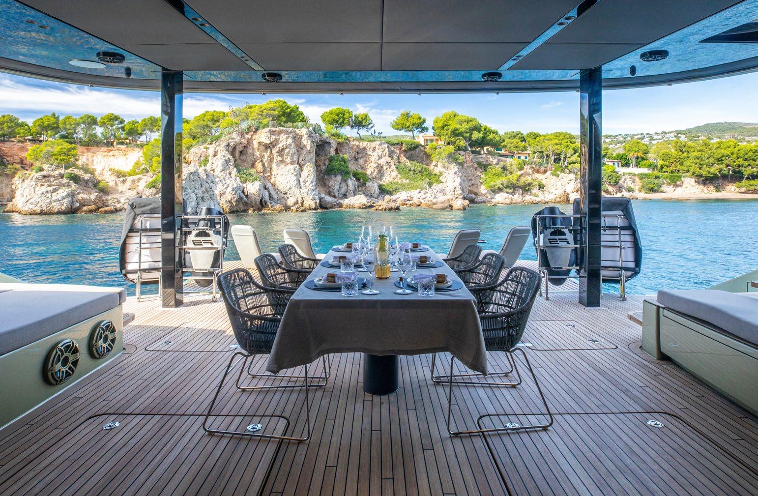 The shaded dining area and outdoor bar are perfect for evenings under the stars, while a swim platform facilitates access to the water, acting almost as a private beach.