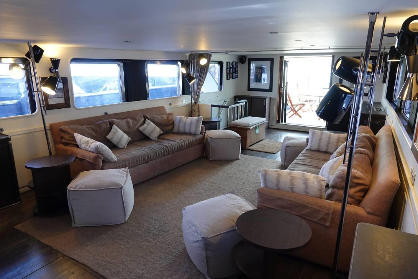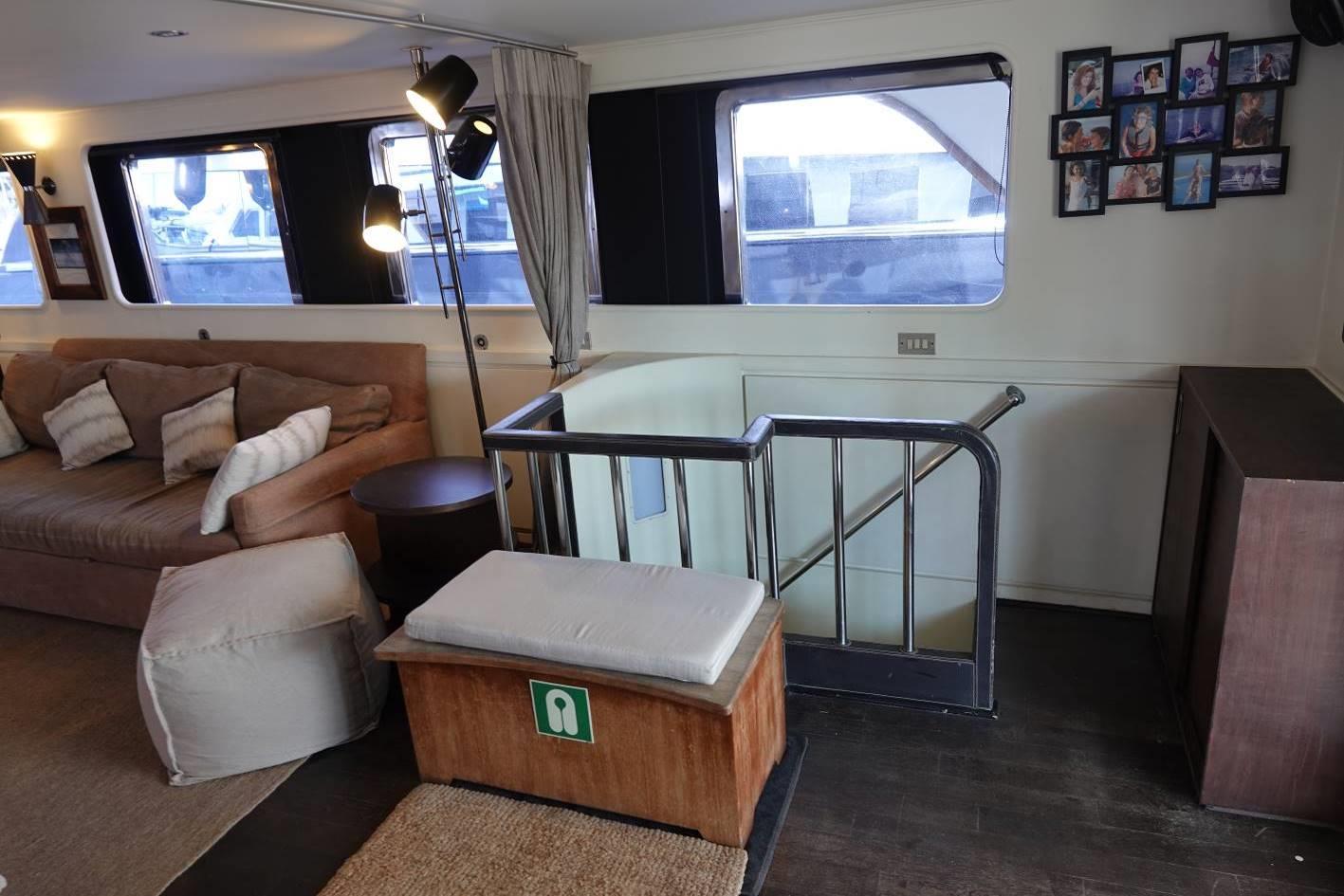Very spacious with 2 larges sofas, chairs, tables and TV Access by stair to the guests’ cabins