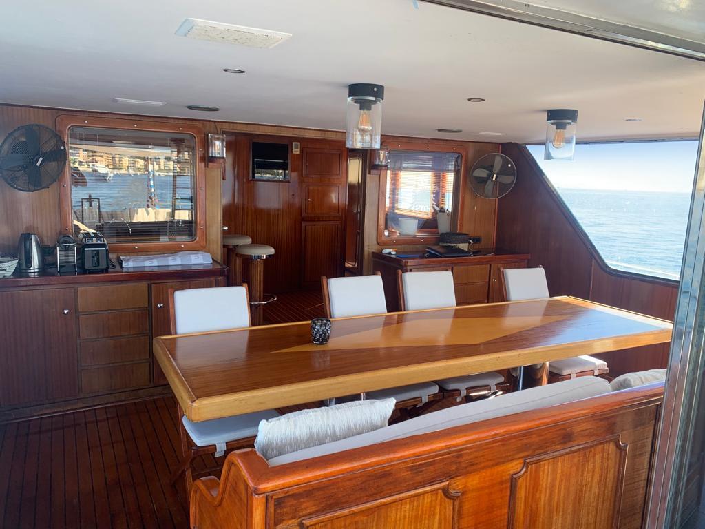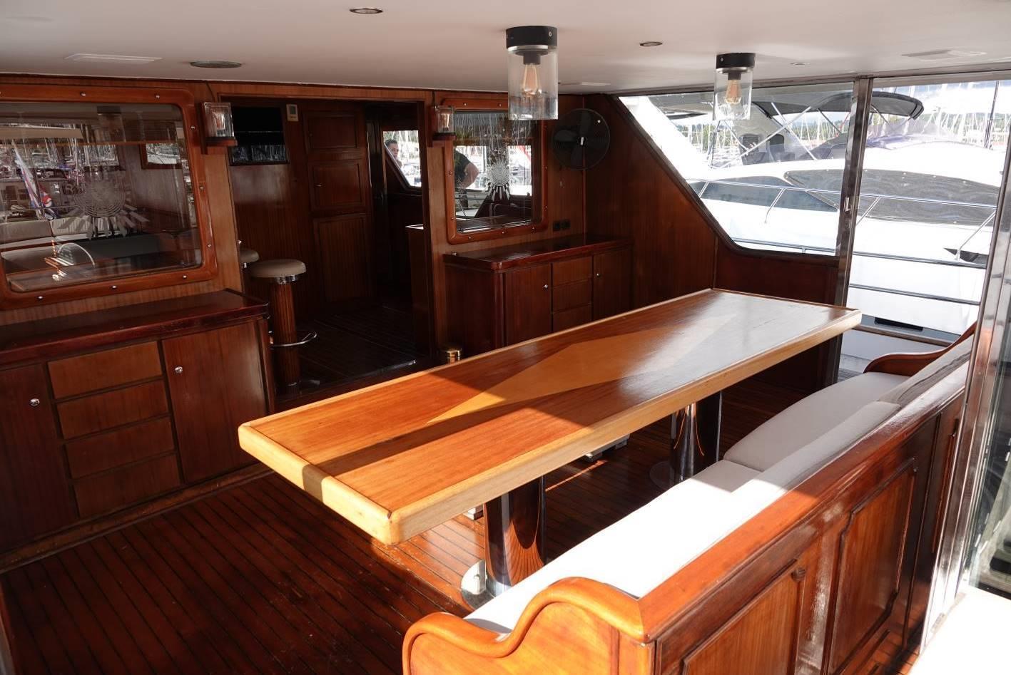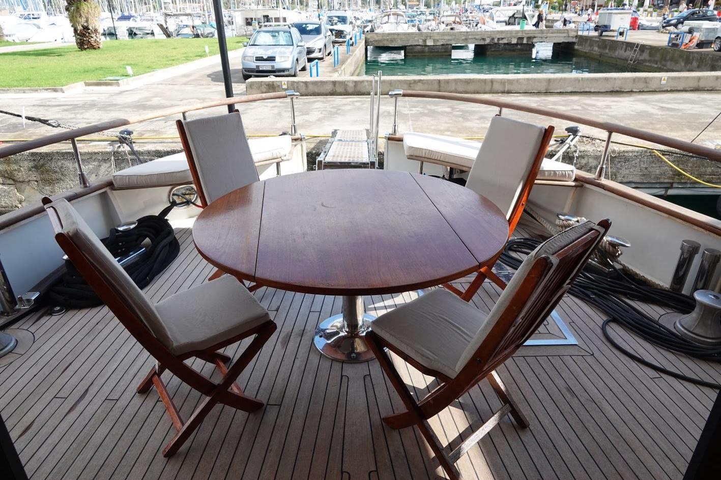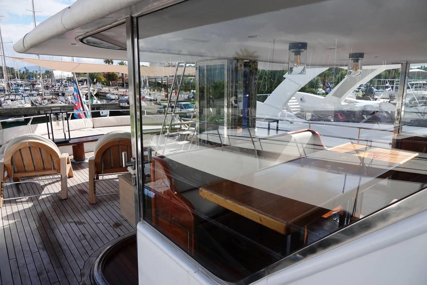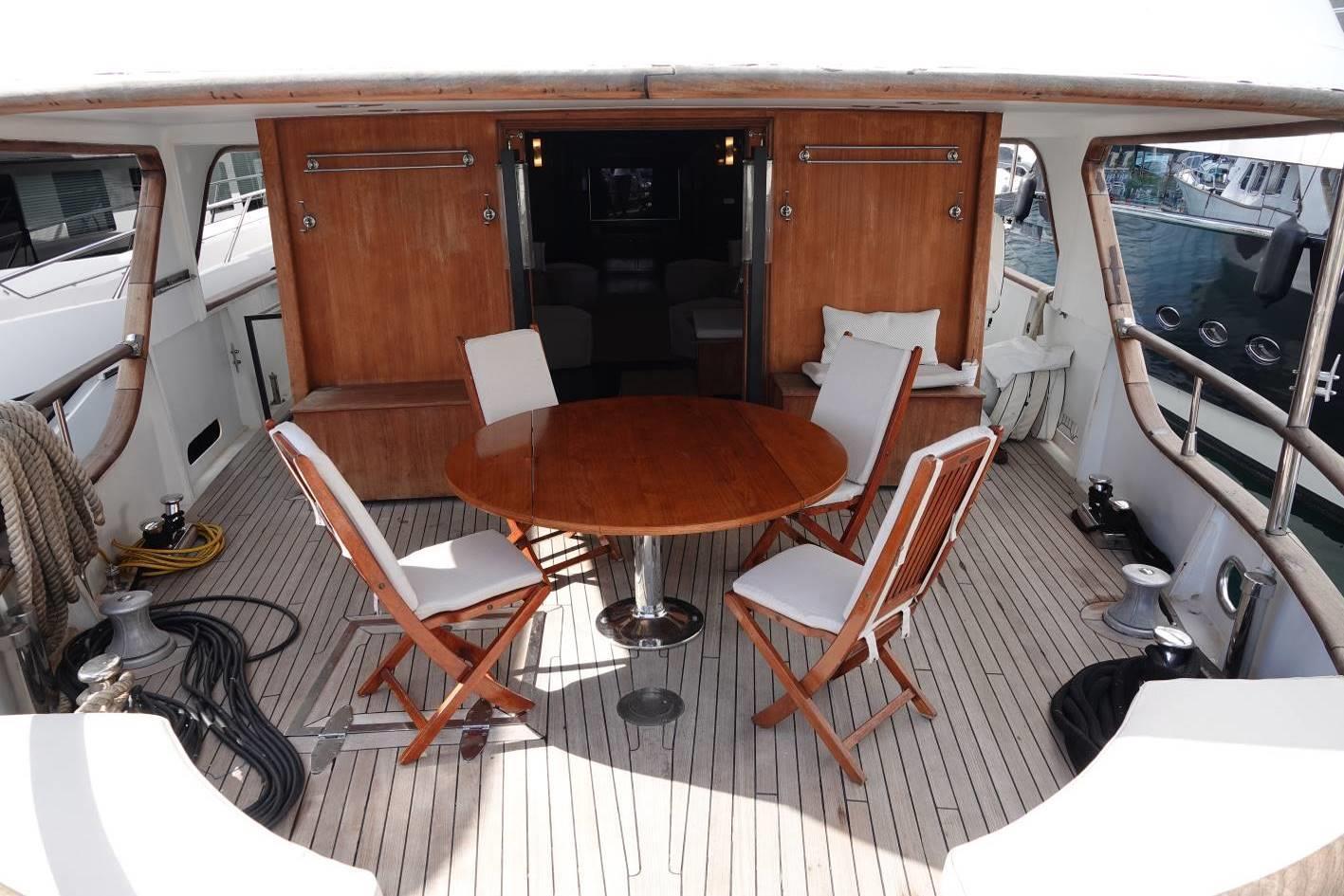 All decks nicely laid up with teak Crane on the front deck to lift the tender and a jet ski Table with chairs in the cockpit on the main deck Large dining table with chairs, plus sofas in the cockpit on the upper deck