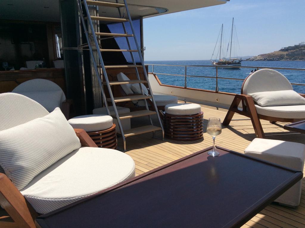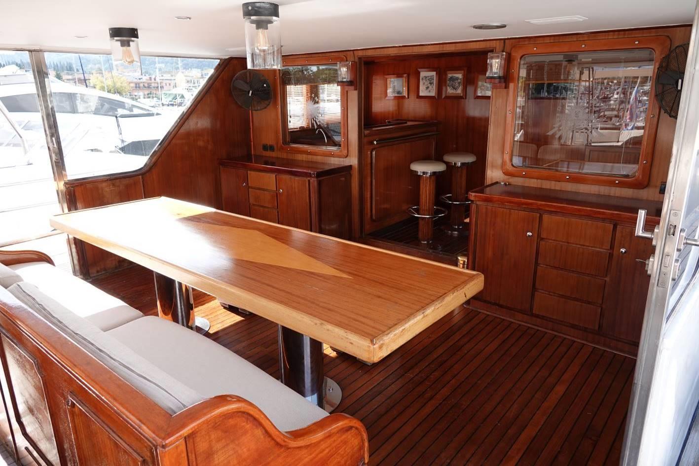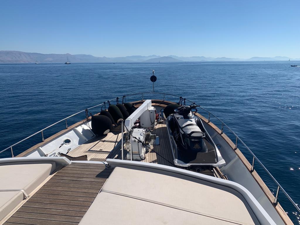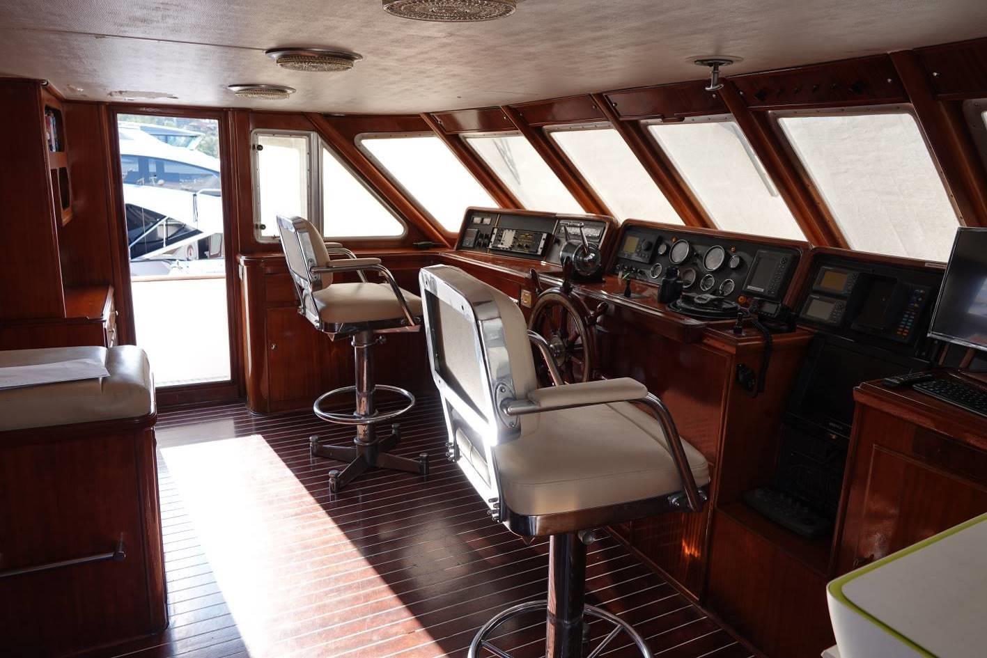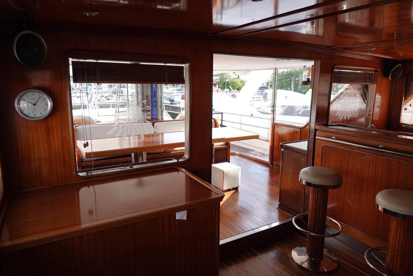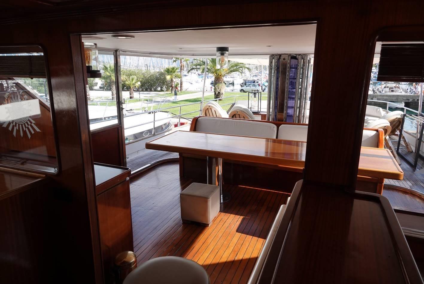 All decks nicely laid up with teak Crane on the front deck to lift the tender and a jet ski Table with chairs in the cockpit on the main deck Large dining table with chairs, plus sofas in the cockpit on the upper deck