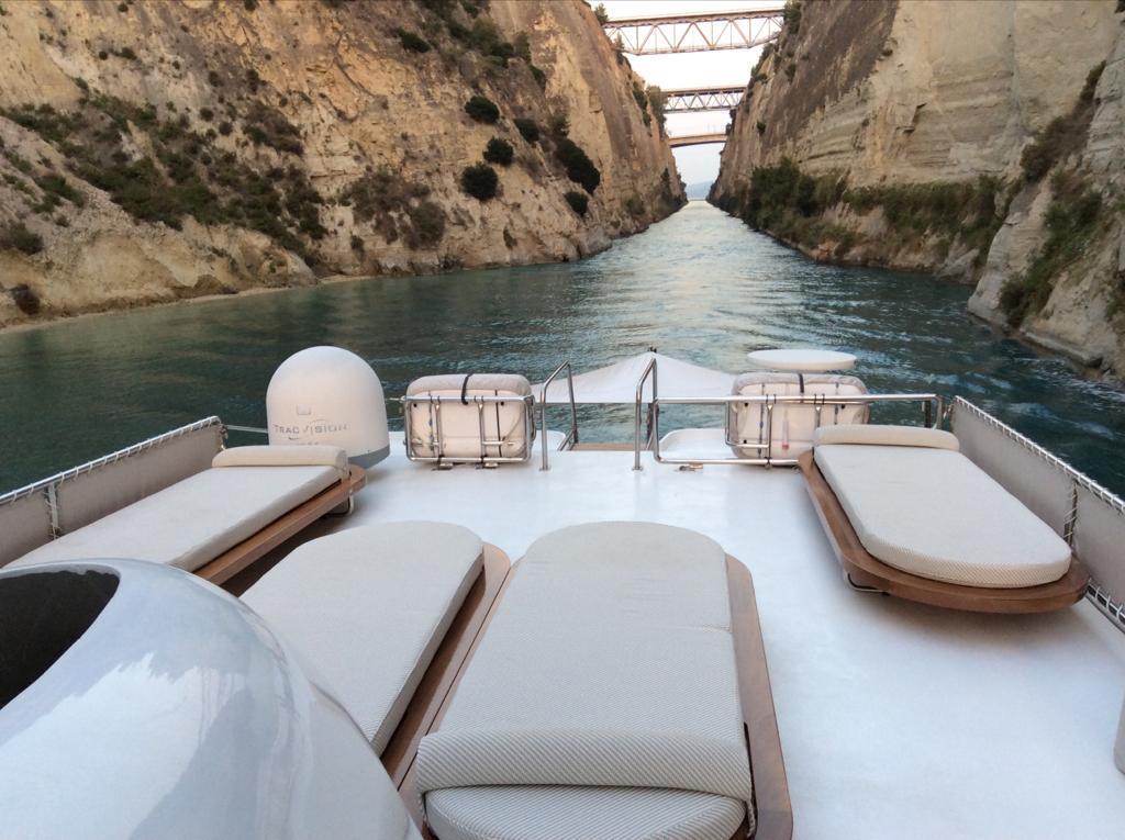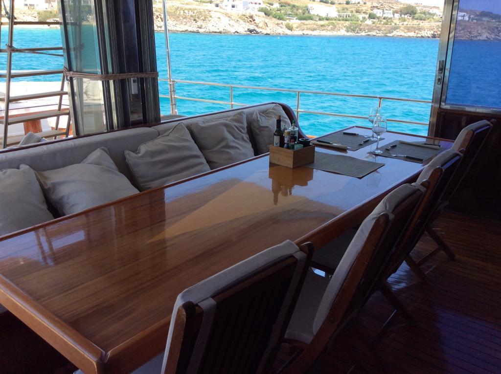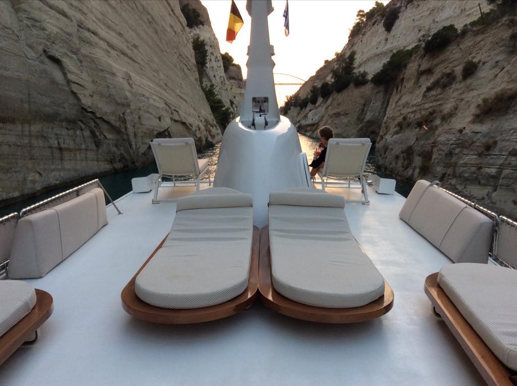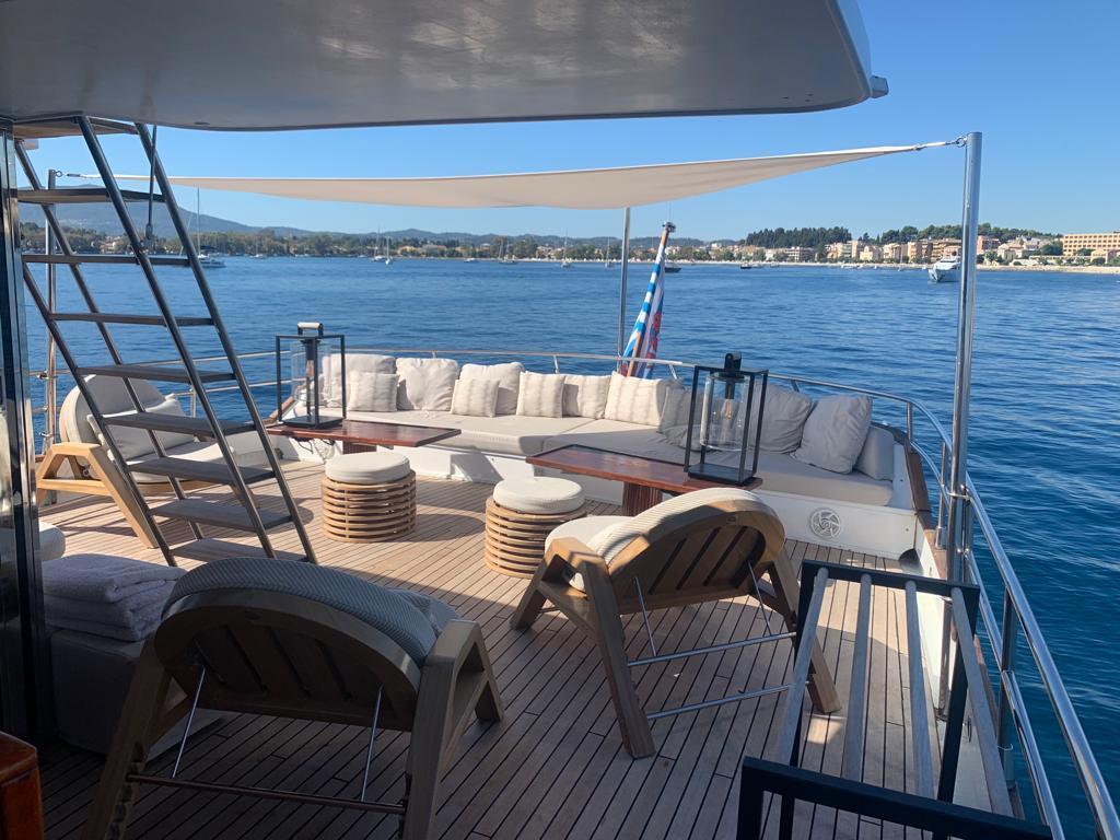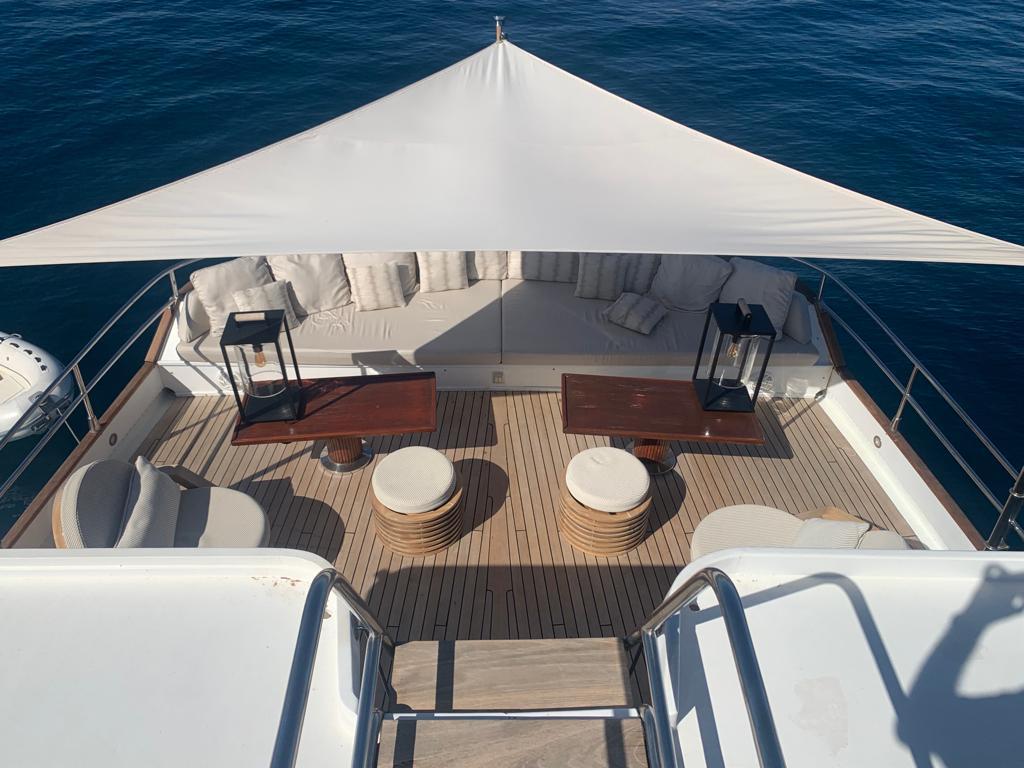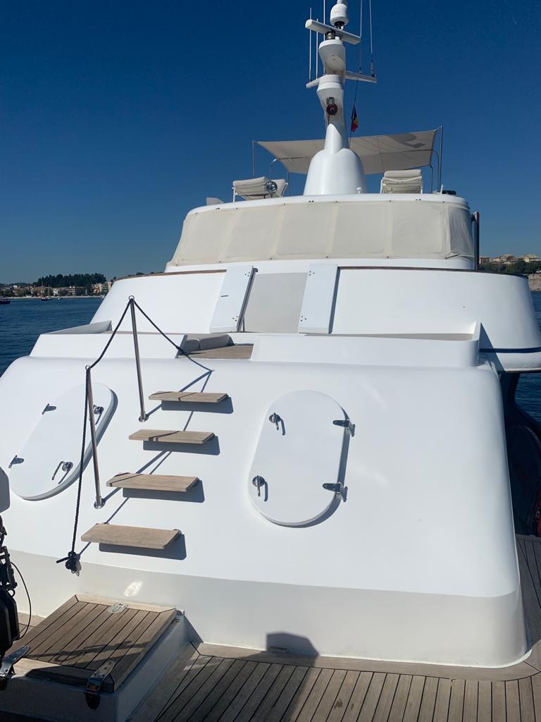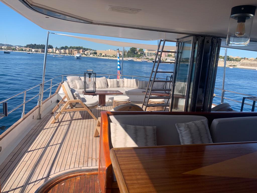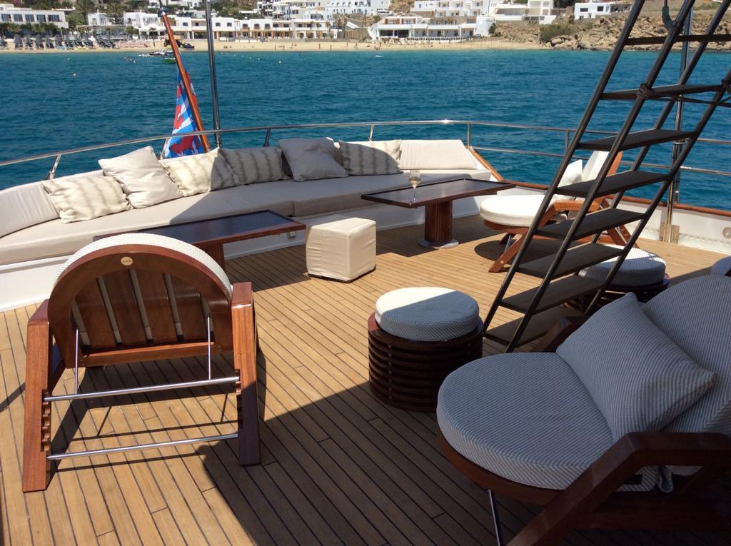 All decks nicely laid up with teak Crane on the front deck to lift the tender and a jet ski Table with chairs in the cockpit on the main deck Large dining table with chairs, plus sofas in the cockpit on the upper deck