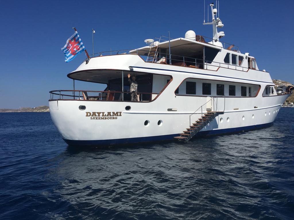 The DAYLAMI, previously named Marga, Kaiser, Why Not, Voyager, features exterior design by Benetti SpA, with naval architecture by Benetti SpA. Up to 8 guests are accommodated on board, and she also has accommodation for 5 crew members including the captain. She has a steel hull and aluminium superstructure. She is powered by 2 General Motors engines, which give her a cruising speed of 13.0 kn and a top speed of 14.0 kn. The yacht has a range of 1,200 nautical miles at a speed of 13.0 kn. She carries 20,000 litres of fuel on board, and 14,000 litres of water.