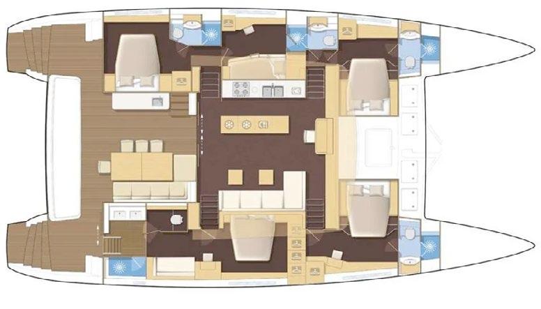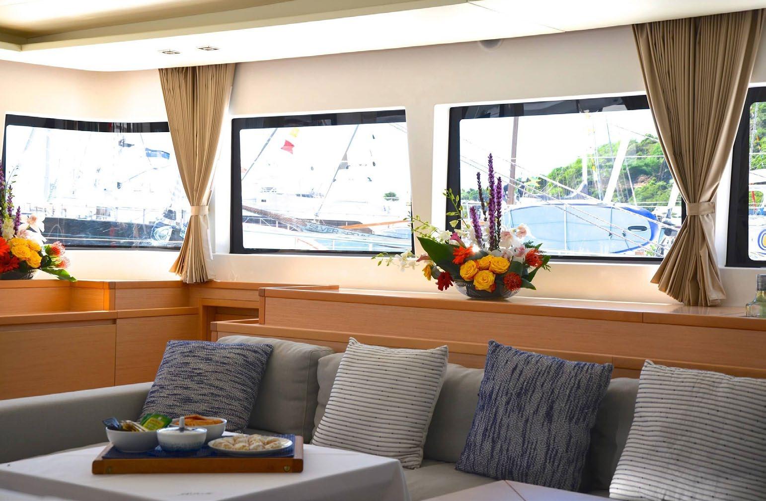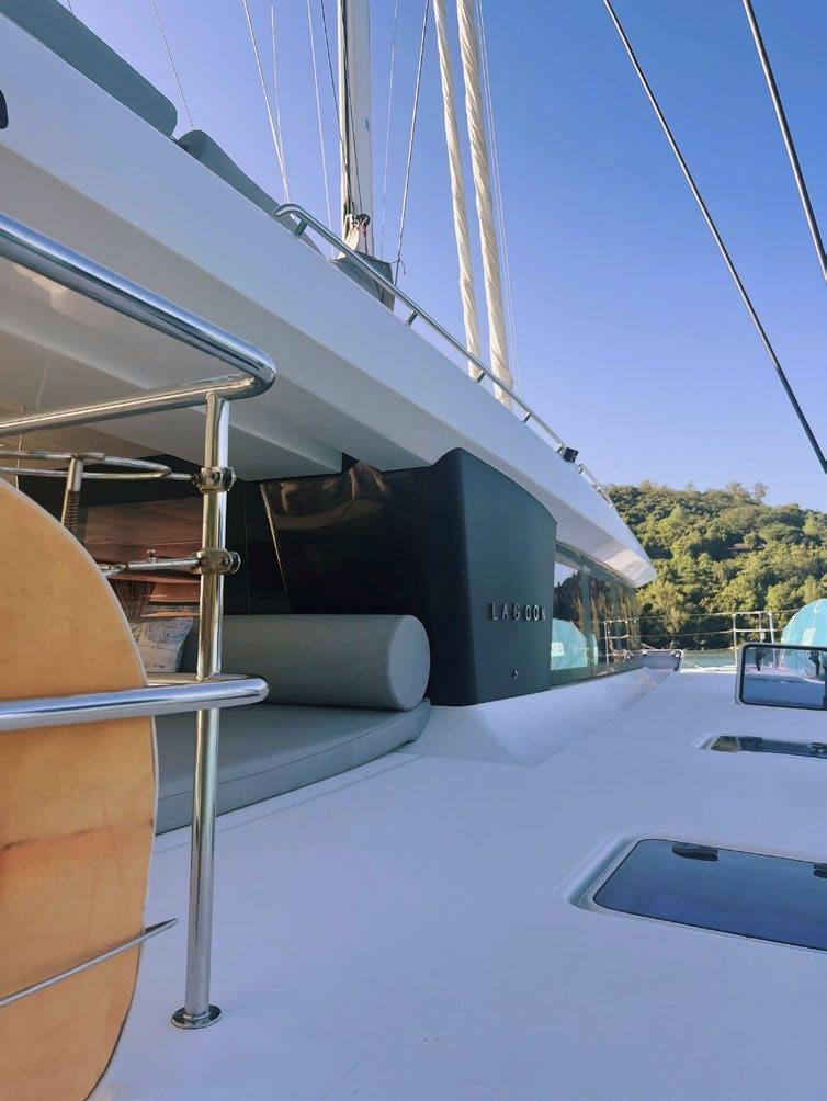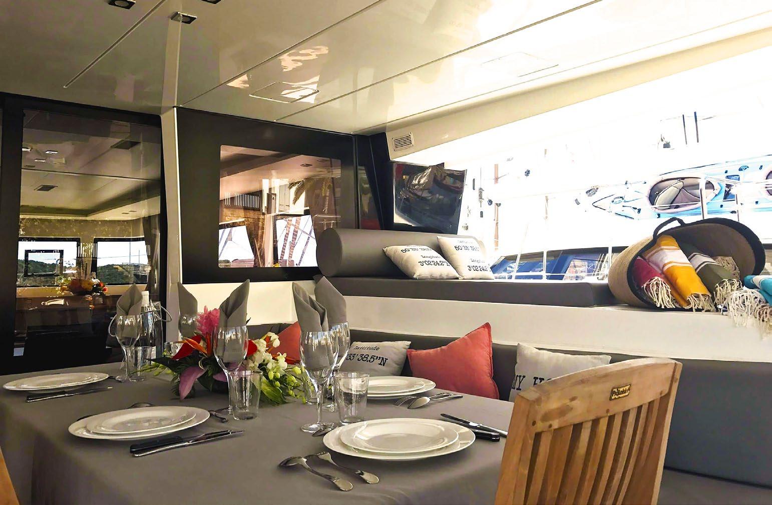 The catamaran’s layout includes a covered flybridge, large central panoramic saloon, and shaded aft cockpit, providing guests with ample space to relax and enjoy the breathtaking ocean views. Al fresco dining is available in the aft cockpit or on the flybridge, while the front trampolines offer a perfect spot for lounging.