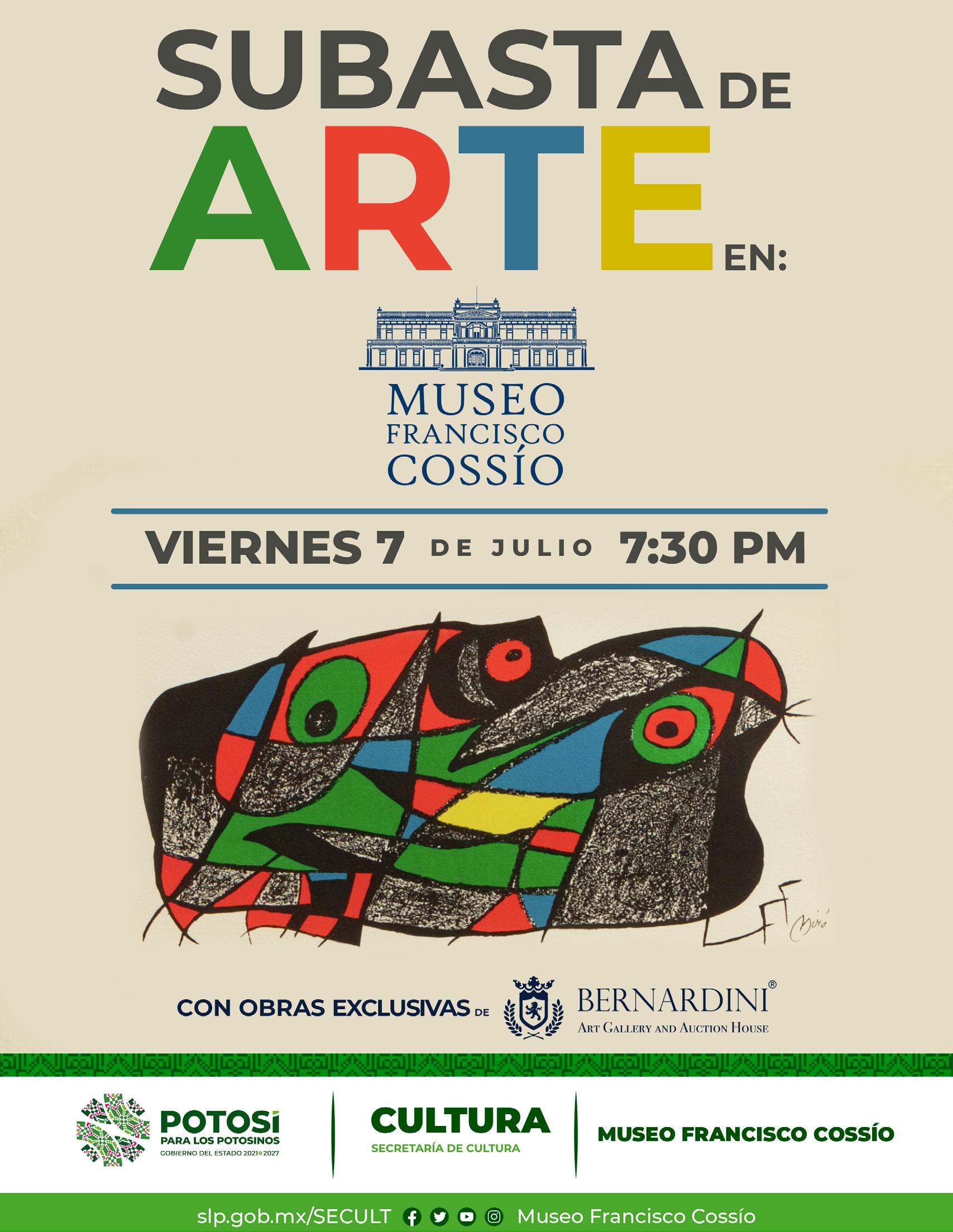 • La subasta se llevará a cabo de manera presencial en las instalaciones de Museo Francisco Cossío , dando inicio a las 19:30 hrs. del día vienes 7 de Julio 2023