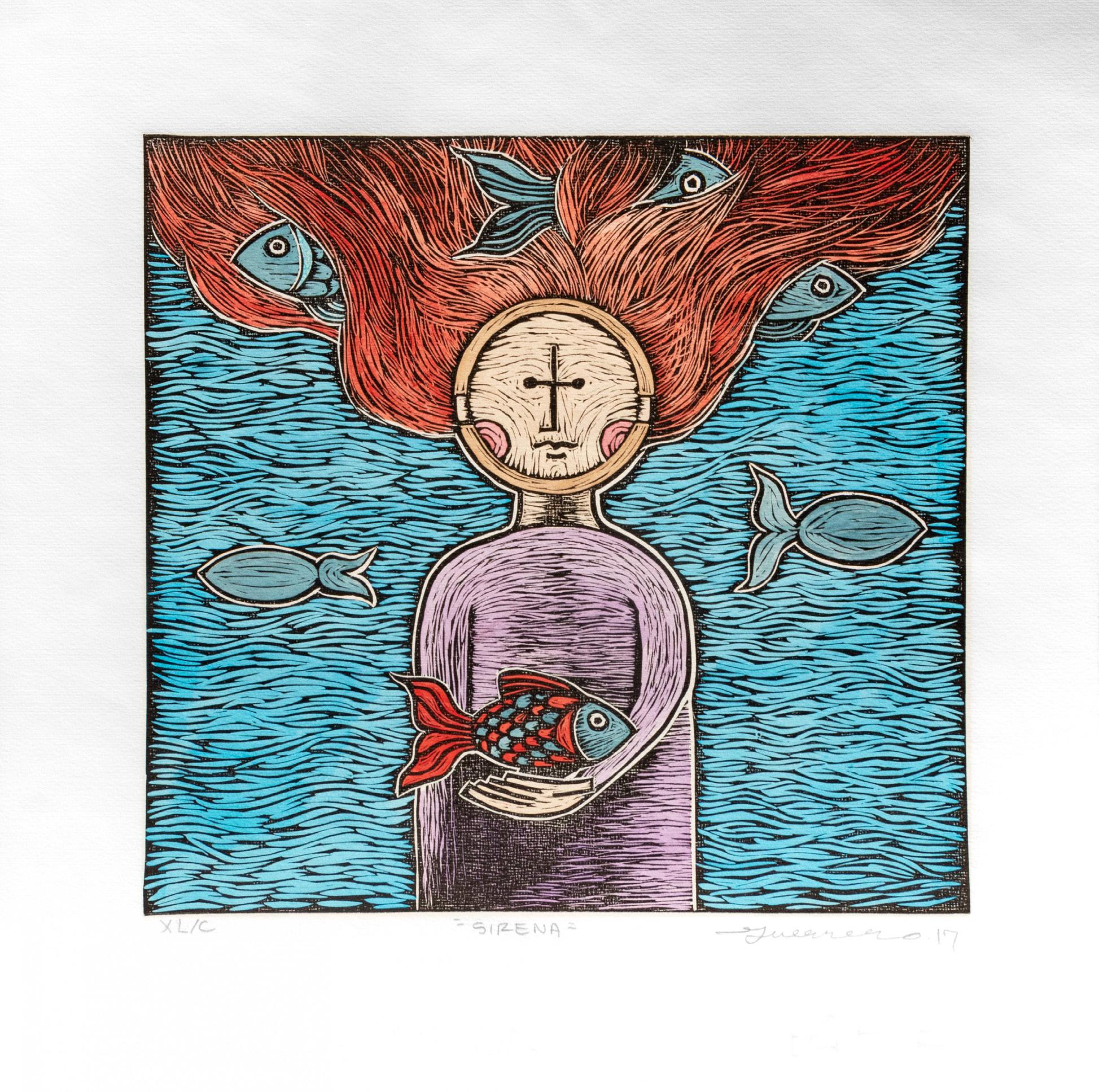 Javier Guerrero “SIRENA” Linograbado y acuarela firmado y numerado con certificado 35 x 35 cm (sin marco) Galería Querétaro
