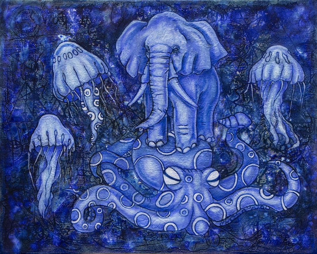 “ELEFANTE CON BEBÉ” Óleo y hoja de oro sobre masonite