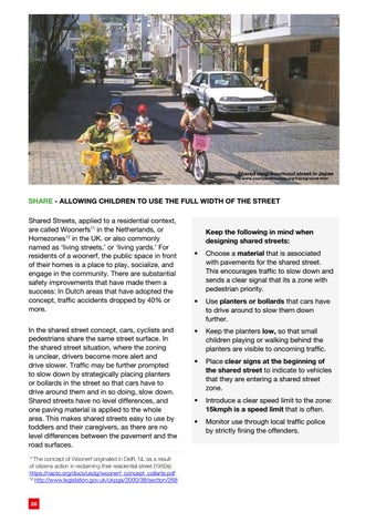 SHARE - ALLOWING CHILDREN TO USE THE FULL WIDTH OF THE STREET Shared Streets, applied to a residential context, are called Woonerfs11 in the Netherlands, or Homezones12 in the UK. or also commonly named as ‘living streets,’ or ‘living yards.’ For residents of a woonerf, the public space in front of their homes is a place to play, socialize, and engage in the community. There are substantial safety improvements that have made them a success: In Dutch areas that have adopted the concept, traffic accidents dropped by 40% or more. In the shared street concept, cars, cyclists and pedestrians share the same street surface. In the shared street situation, where the zoning is unclear, drivers become more alert and drive slower. Traffic may be further prompted to slow down by strategically placing planters or bollards in the street so that cars have to drive around them and in so doing, slow down. Shared streets have no level differences, and one paving material is applied to the whole area. This makes shared streets easy to use by toddlers and their caregivers, as there are no level differences between the pavement and the road surfaces. The concept of Woonerf originated in Delft, NL as a result of citizens action in reclaiming their residential street (1960s) https://nacto.org/docs/usdg/woonerf_concept_collarte.pdf 12 http://www.legislation.gov.uk/ukpga/2000/38/section/268 11