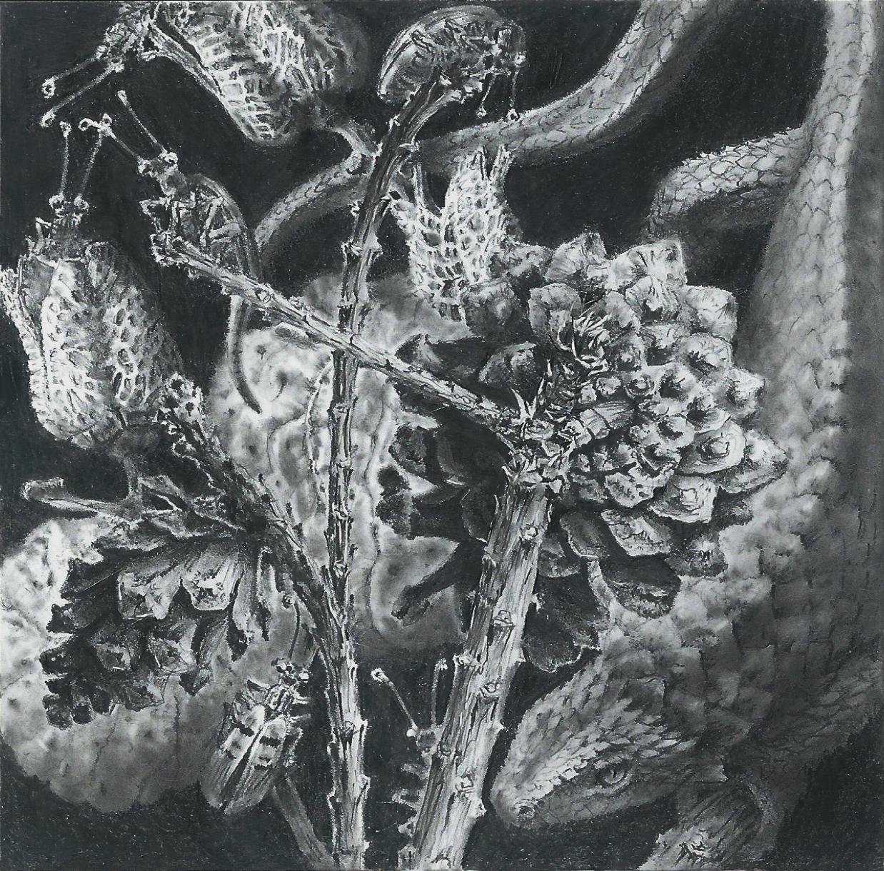 Stephanie Anderson’s graphite drawings are hyper realistic, crisp representations of animals and flora. Her scenes are so detailed and elaborate that it often takes several examinations to reveal all the hidden creatures within the drawings.