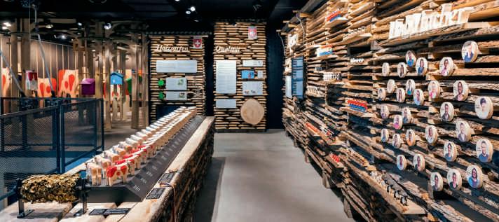 Holz ist auch im Innern der Erlebniswelt sehr präsent – dasselbe gilt für die Kuh. Auf einem kostenpflichtigen Rundgang kann man Schritt für Schritt miterleben, wie aus einem Brett aus zertifiziertem Schweizer Holz eine Kuh wird. Der Rundgang ist optisch schön gestaltet mit Schaukästen in Form von Vogelhäusern, einer Sägerei und als Abschluss einem begehbaren Glasspiegelraum, in dem sich die Kühe unendlich weit spiegeln. Aufwendige 24-mal wird das Stück in die Hand genommen, bevor es im Shop als Kuh gekauft werden kann. Wer mag, kann in der Schnitzerboutique und der Malwerkstatt auch selber Hand anlegen.