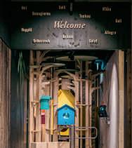 Wood also features extensively in the interior of the World of Expe rience – as does the cow. Visitors can take a tour and discover step by step how a board of certified Swiss wood is transformed into a cow. The non-guided tour is visually beautifully designed, with display cases in the form of bird nesting boxes, a sawmill, and, at the end, a hall of mirrors with cows reflected to infinity and beyond. Each piece is meticulously worked 24 times before it can be sold as a cow in the shop. Visitors can even try their hand at carving and painting one of their own in the carving boutique and the painting workshop.