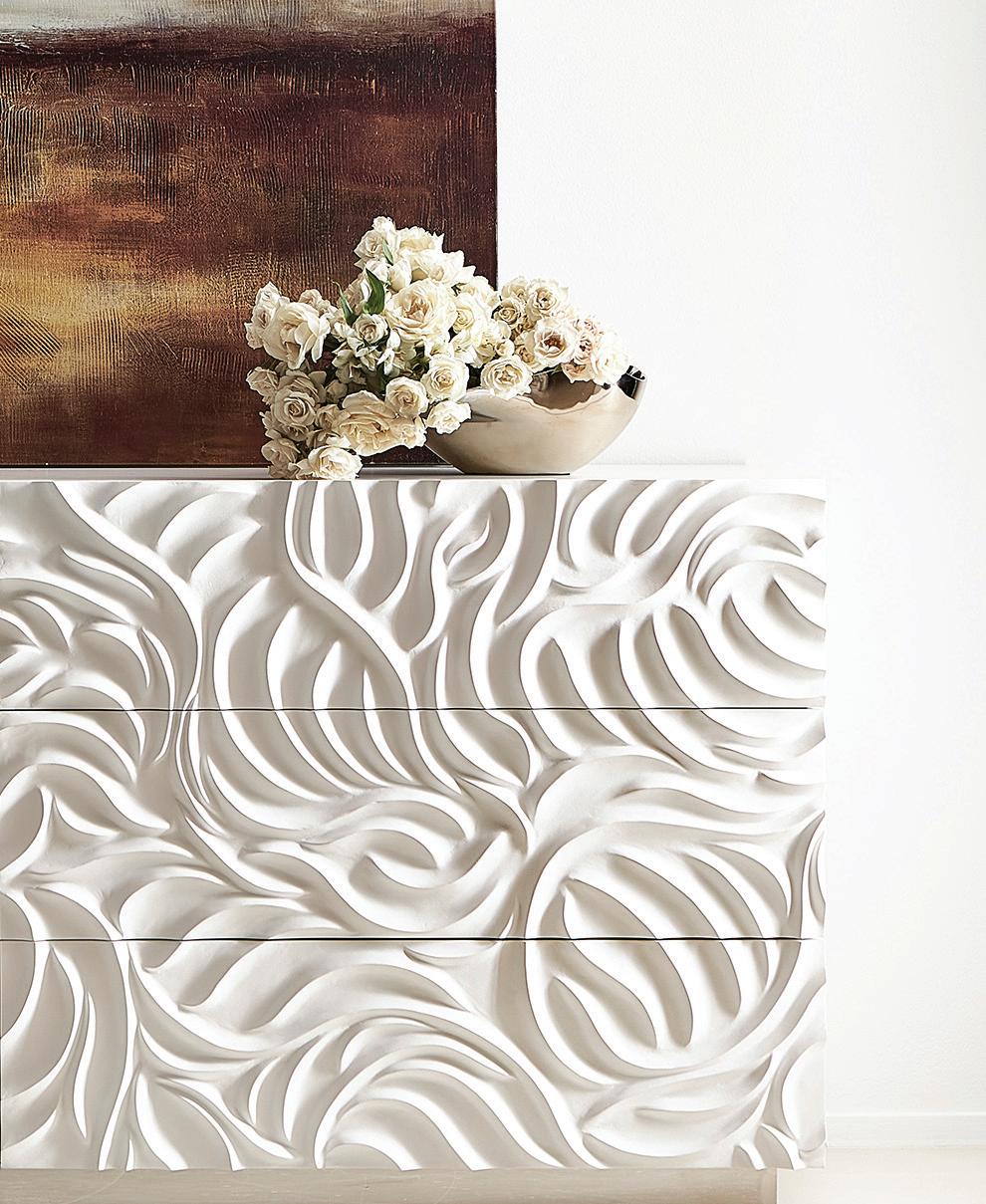 Materials/Finishes: White Plaster finish on case and three push-to-open, soft-close drawers with carved cast resin fronts. Polished Stainless Steel recessed plinth base.