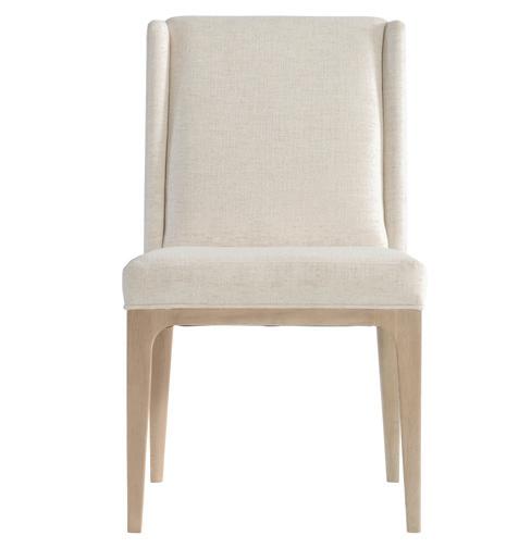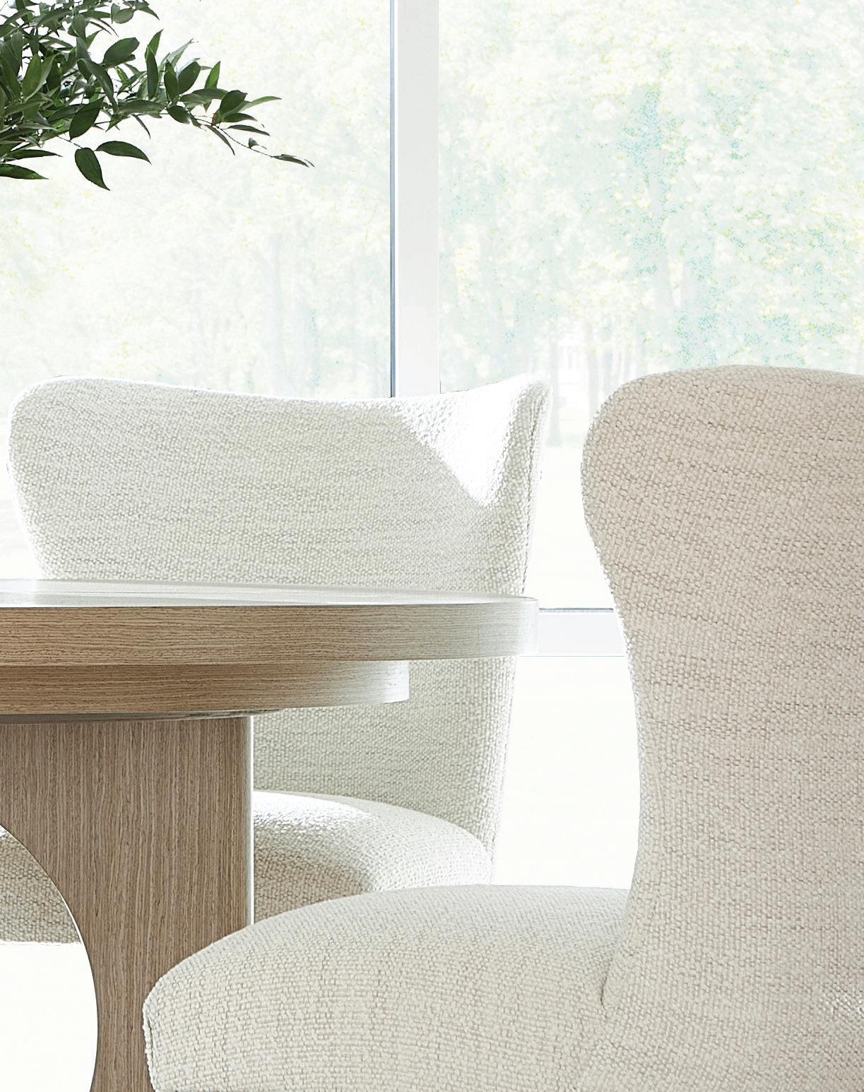 Collection textiles include woven and textural fabrics in neutral ivory hues with a matte finish.
